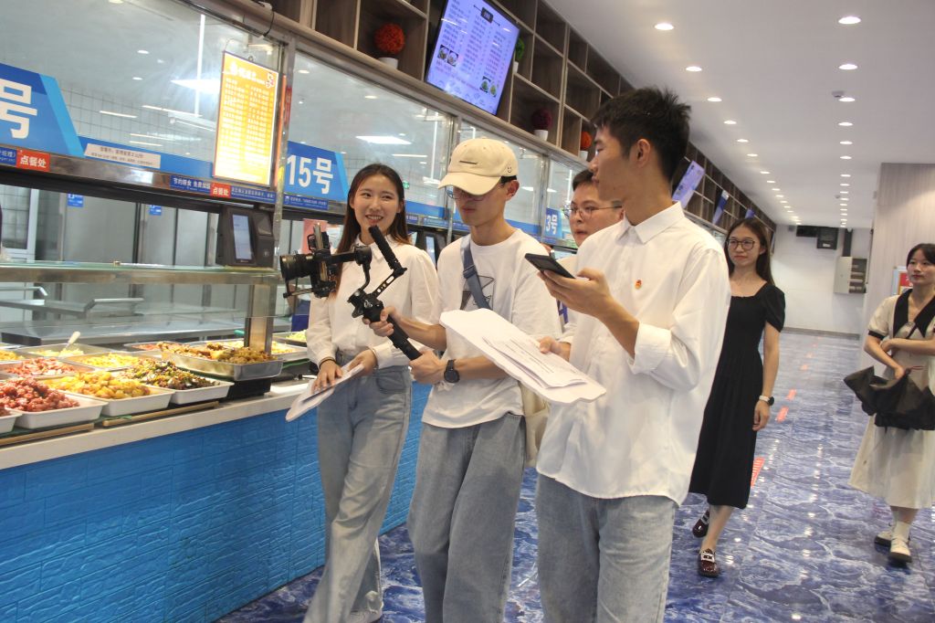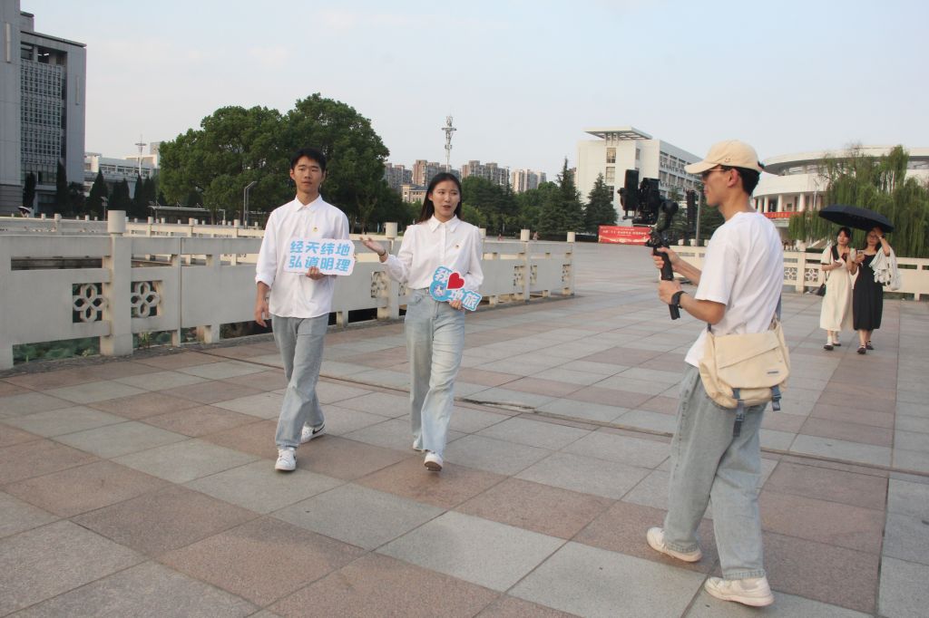 “现在我们所在的位置是学校东大门和敬文图书馆的连接轴线上,大家可以看到‘厚德 重教 博学 笃行’八个大字,这就是我们师大的校训。”2021级地理科学专业蔡子坤和2021级旅游管理专业张新悦“变身”主播带领新生由学校东大门开始游览校园。