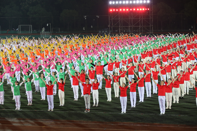 高歌曼舞传扬体育精神。文艺表演环节百花齐放,惊喜不断。舞龙表演威风凛凛,气势磅礴。百余名师生制作80余只非遗鱼灯,舞活一幅鱼灯国画。民族健身舞《梦圆中国》激情四射、《少年中国说》武术表演意气风发、拉丁舞《时代青春》动感十足。在千人齐舞《一起向未来》表演中,色情动漫