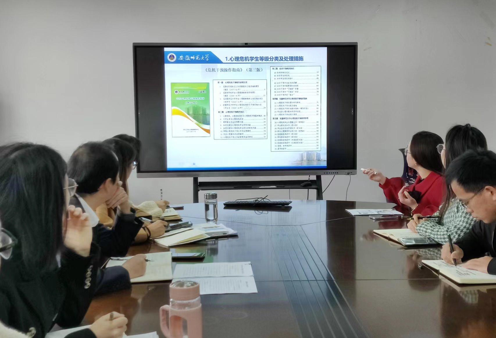 首先,乔静介绍本次专题培训的目的和背景,并对聂余老师前来作报告表示欢迎。接着,聂余做题为《危机干预专题研讨交流》的专题报告,她从心理危机学生等级分类及处理措施、危机干预系统更新事项、心理危机干预注意事项三个方面进行讲述。聂余通过丰富的案例,讲解了在面对学生心理问题时的应对方法,并就在日常工作中如何掌握心理健康的调适方法做了深入浅出地指导培训。最后,乔静做会议总结,他对聂余的精彩报告给予充分肯定并表示感谢,同时希望全体辅导员在日常工作中调适好心理状态,积极为学院深入推进全员心理育人工作贡献力量,把解决学生思想问题、心理问题与解决实际问题结合起来,进一步提升工作实效性。