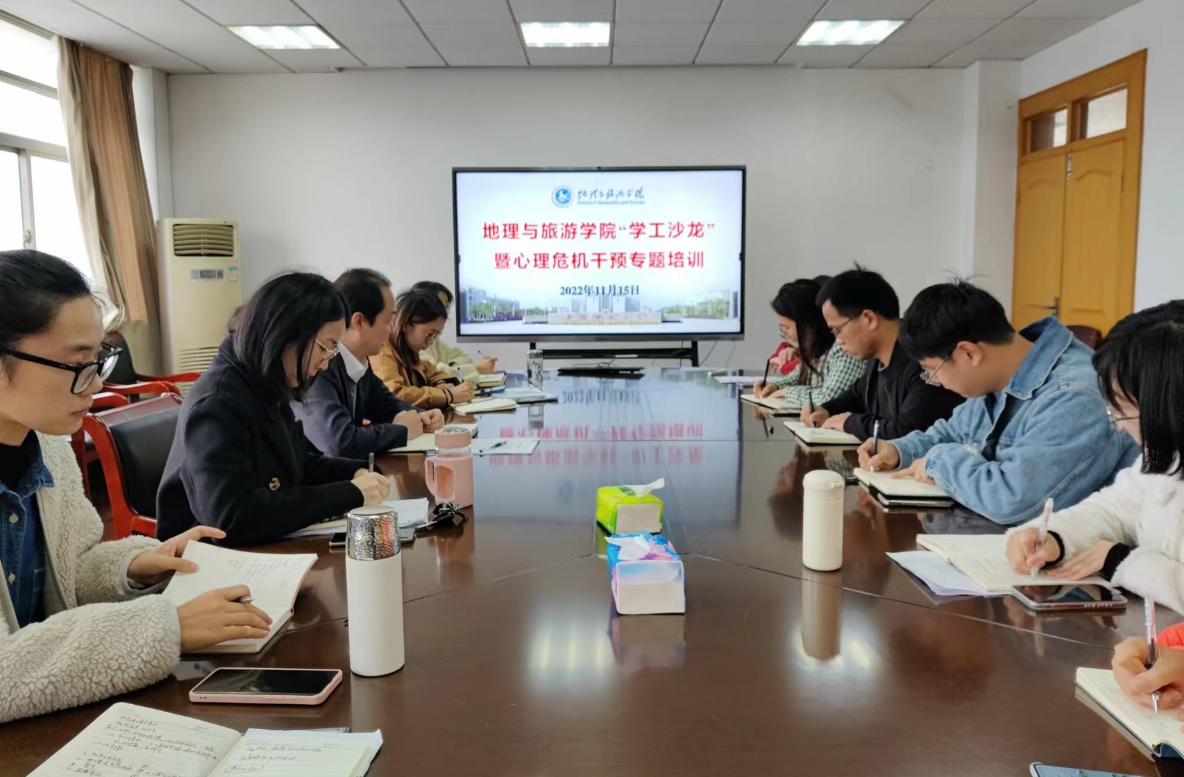 邀请校大学生心理健康教育中心心理咨询师聂余为全体专兼职辅导员做心理危机干预专题培训。会议由学院党委副书记乔静主持,学院全体本科生、研究生专兼职辅导员参会。