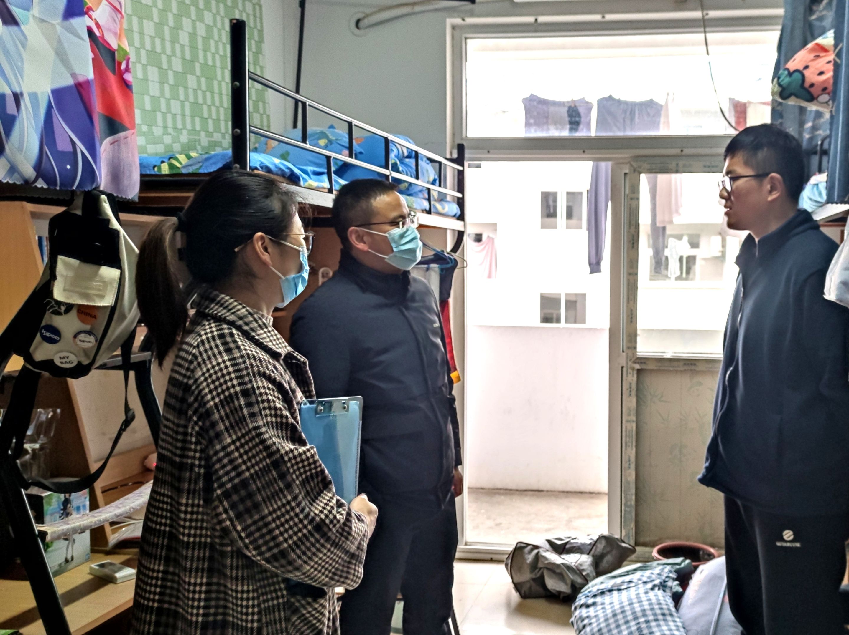 领导与辅导员深入学生宿舍一线,了解学生学习生活动态,细致排查宿舍安全隐患。建立“校-院-班”三级联动的寝室安全隐患排查机制,将学院每周三宿舍安全抽查与各班级每周宿舍安全突击自查相结合,对存在的安全隐患进行写实性通报并提出整改意见,班级督导整改。排查学生健康隐患。对患有基础疾病和身体出现异常学生精准梳理、建立档案、密切关注、跟踪关怀。