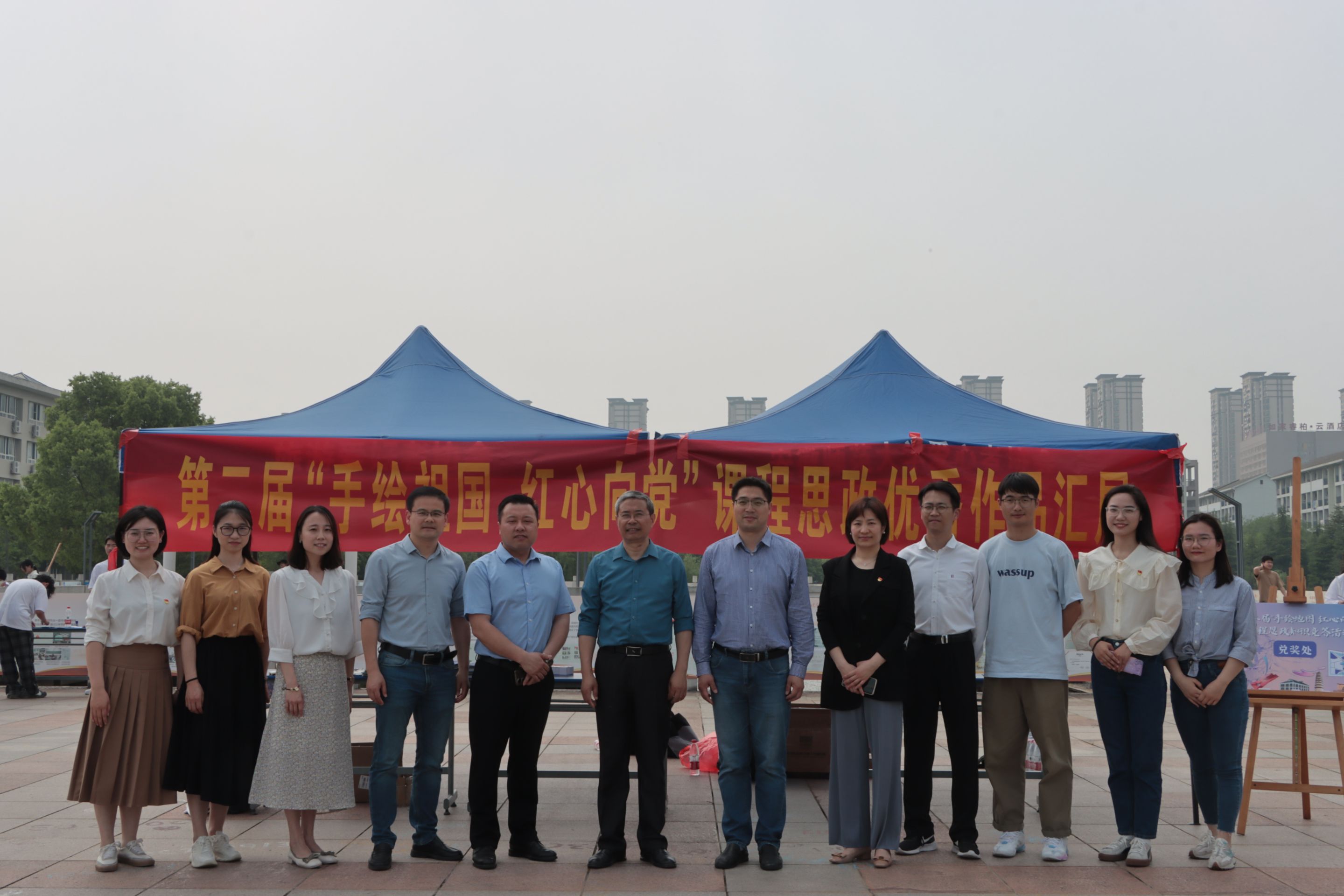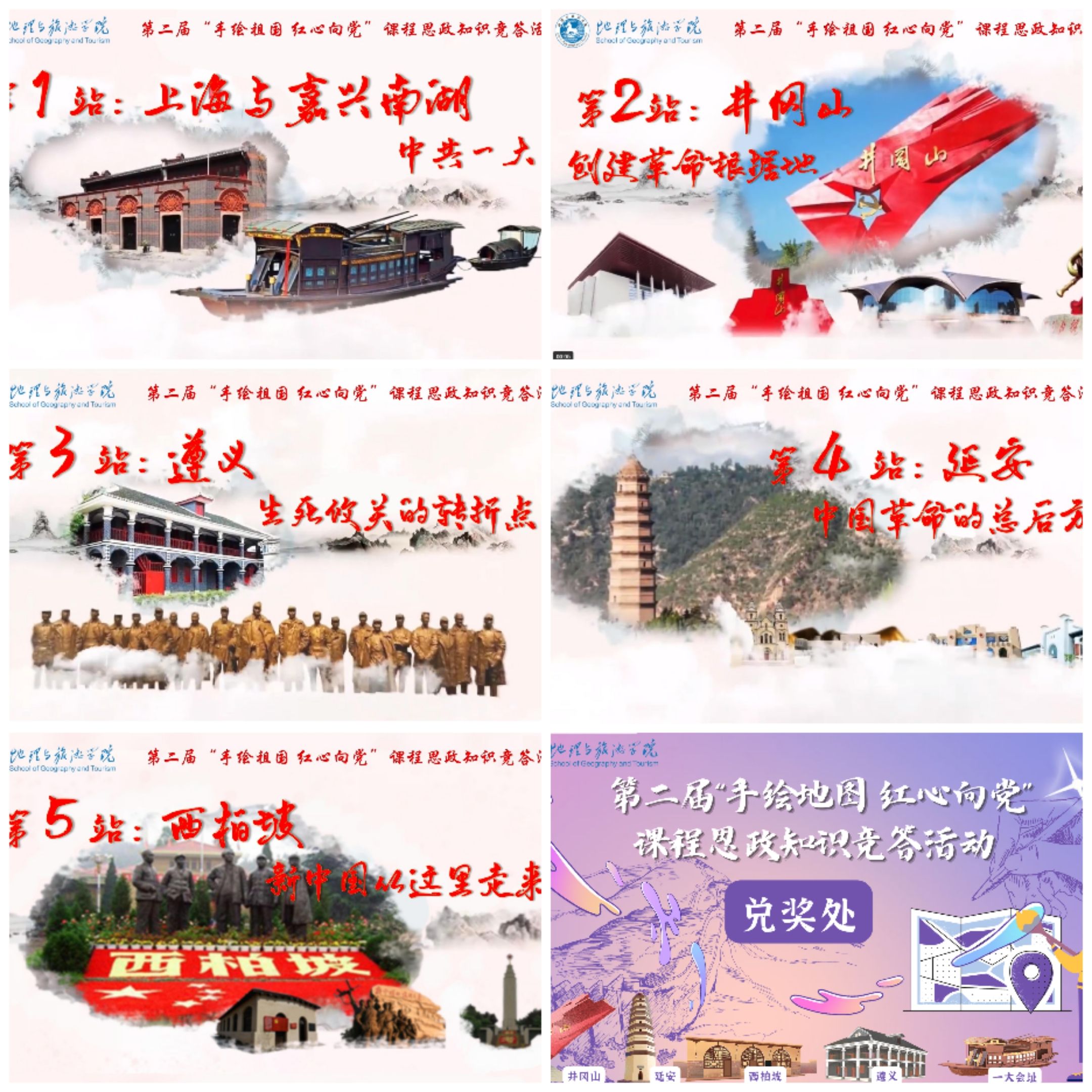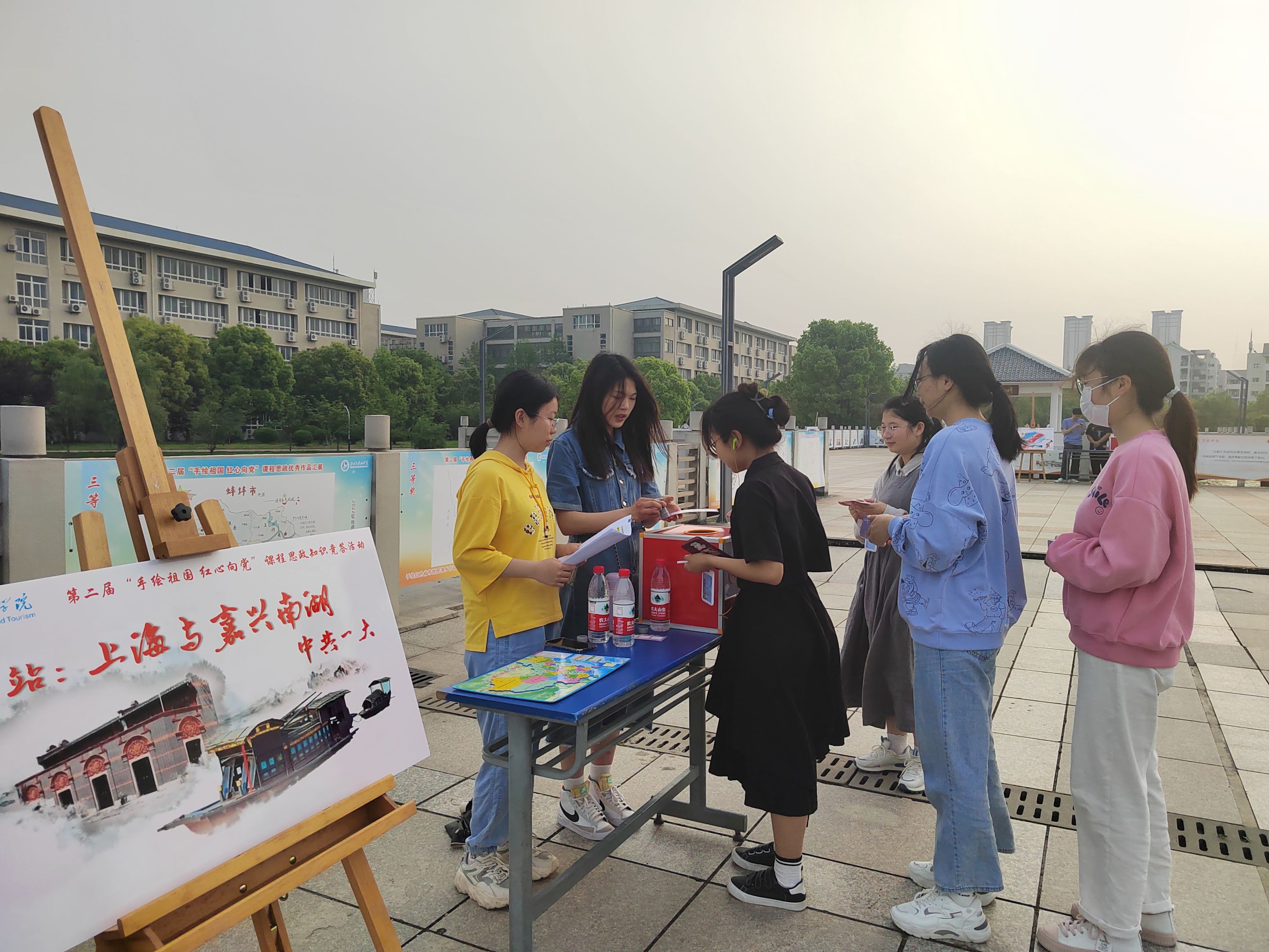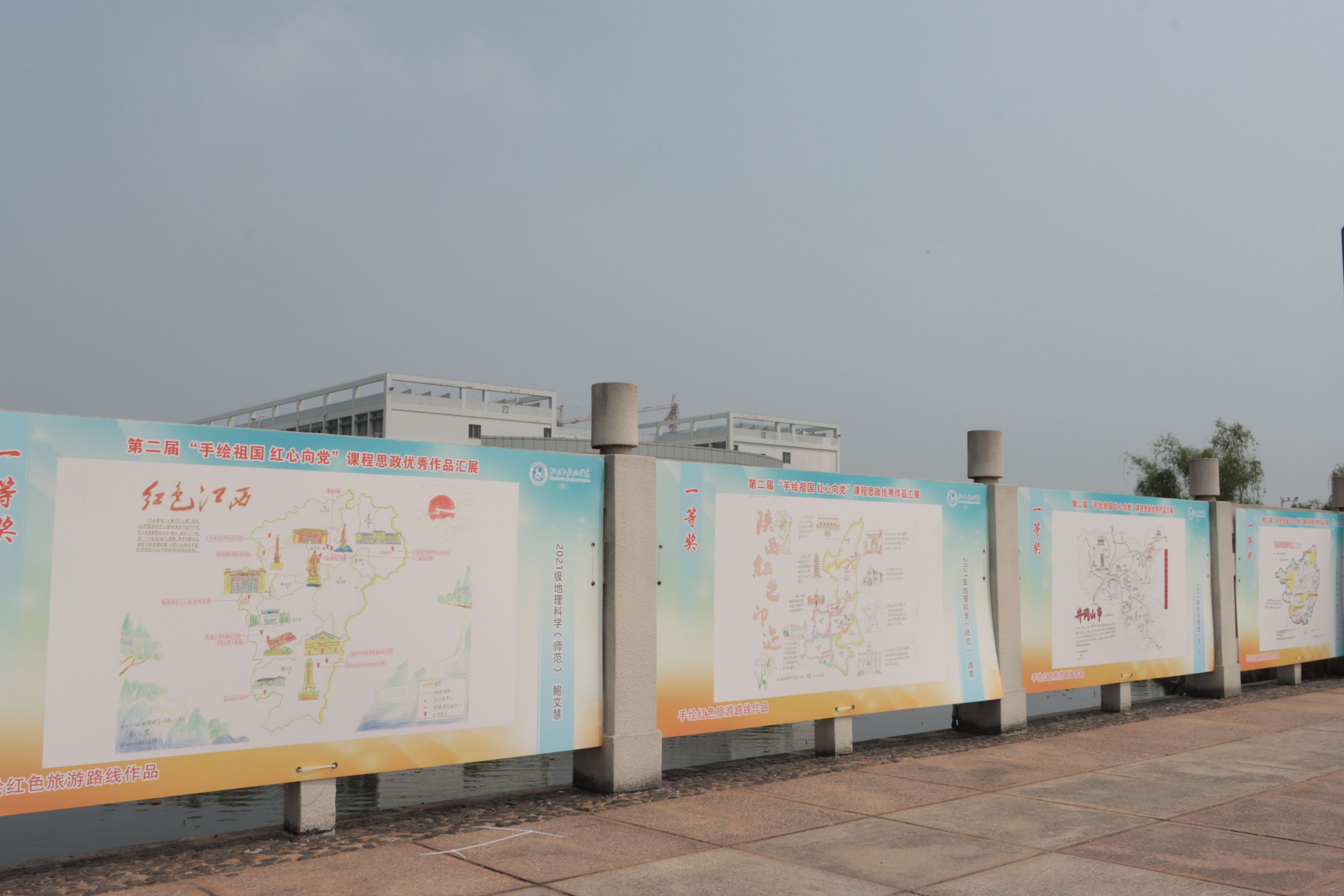 专业特色,举办了第二届“手绘祖国 红心向党”课程思政手绘地图征集活动,并于学校九曲桥开展了优秀作品汇展暨知识竞答活动。