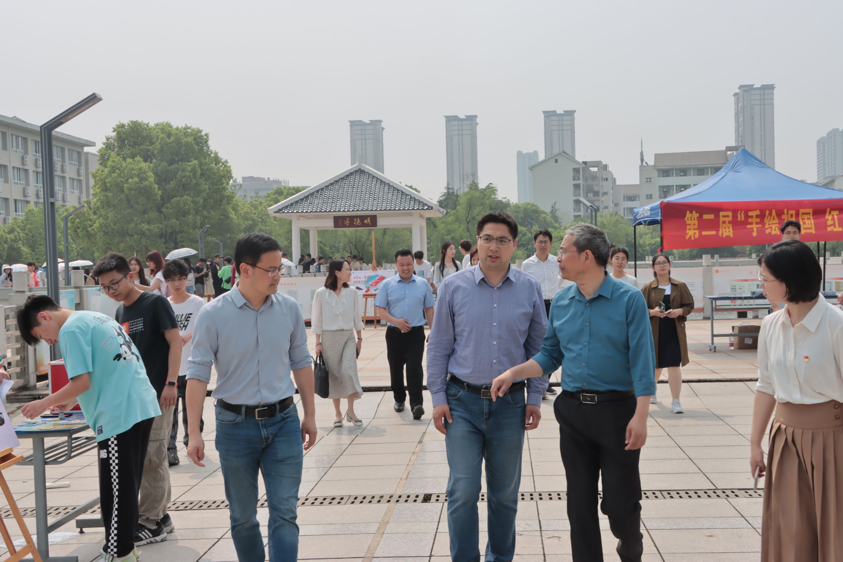 党委副书记付勇等来到花津校区九曲桥前,现场参观优秀手绘作品。