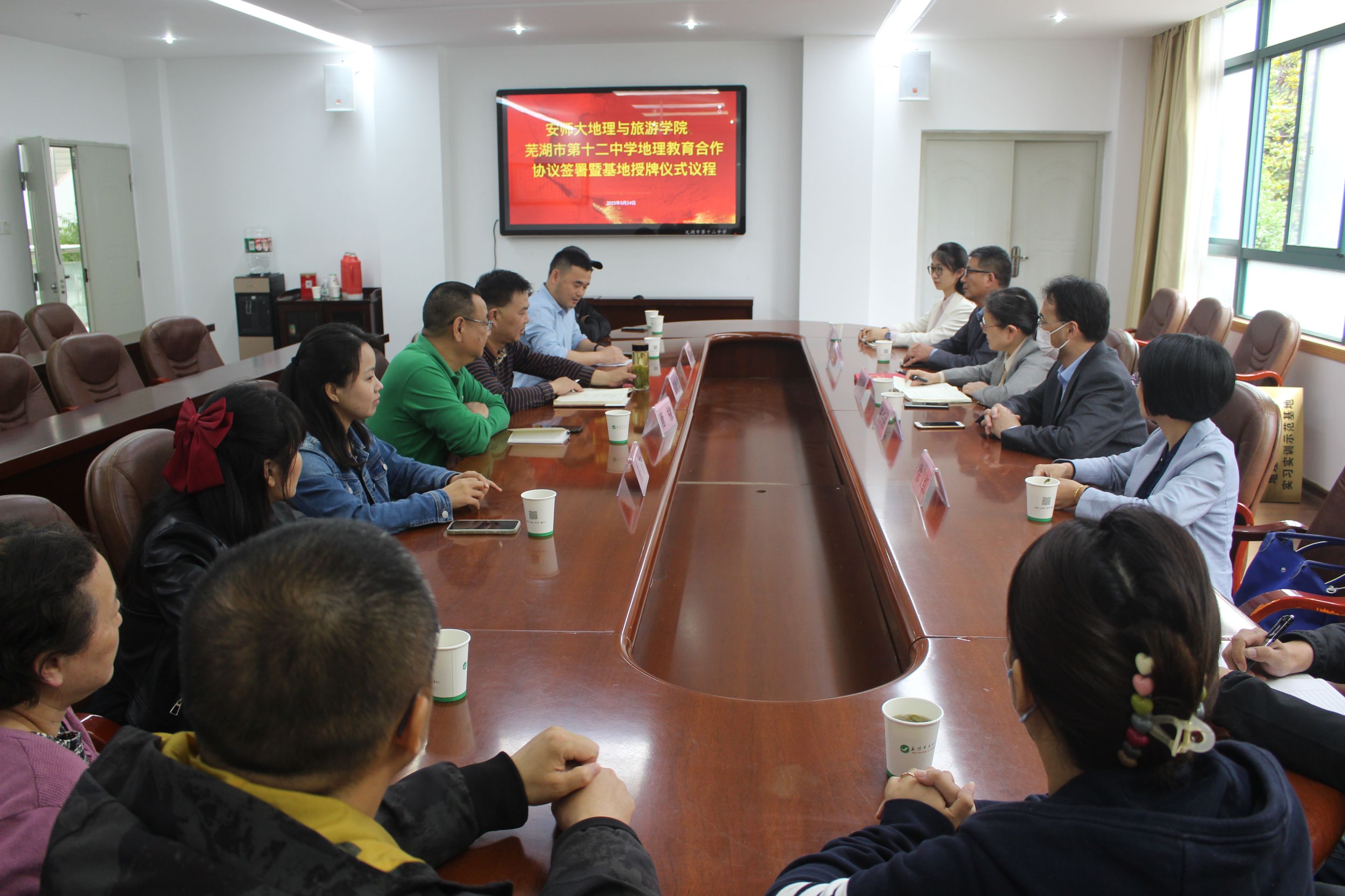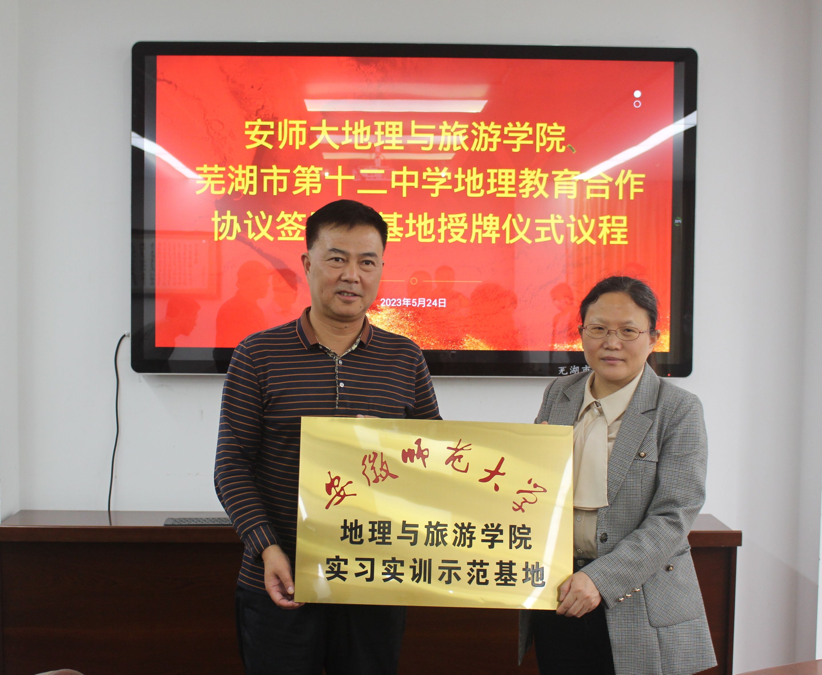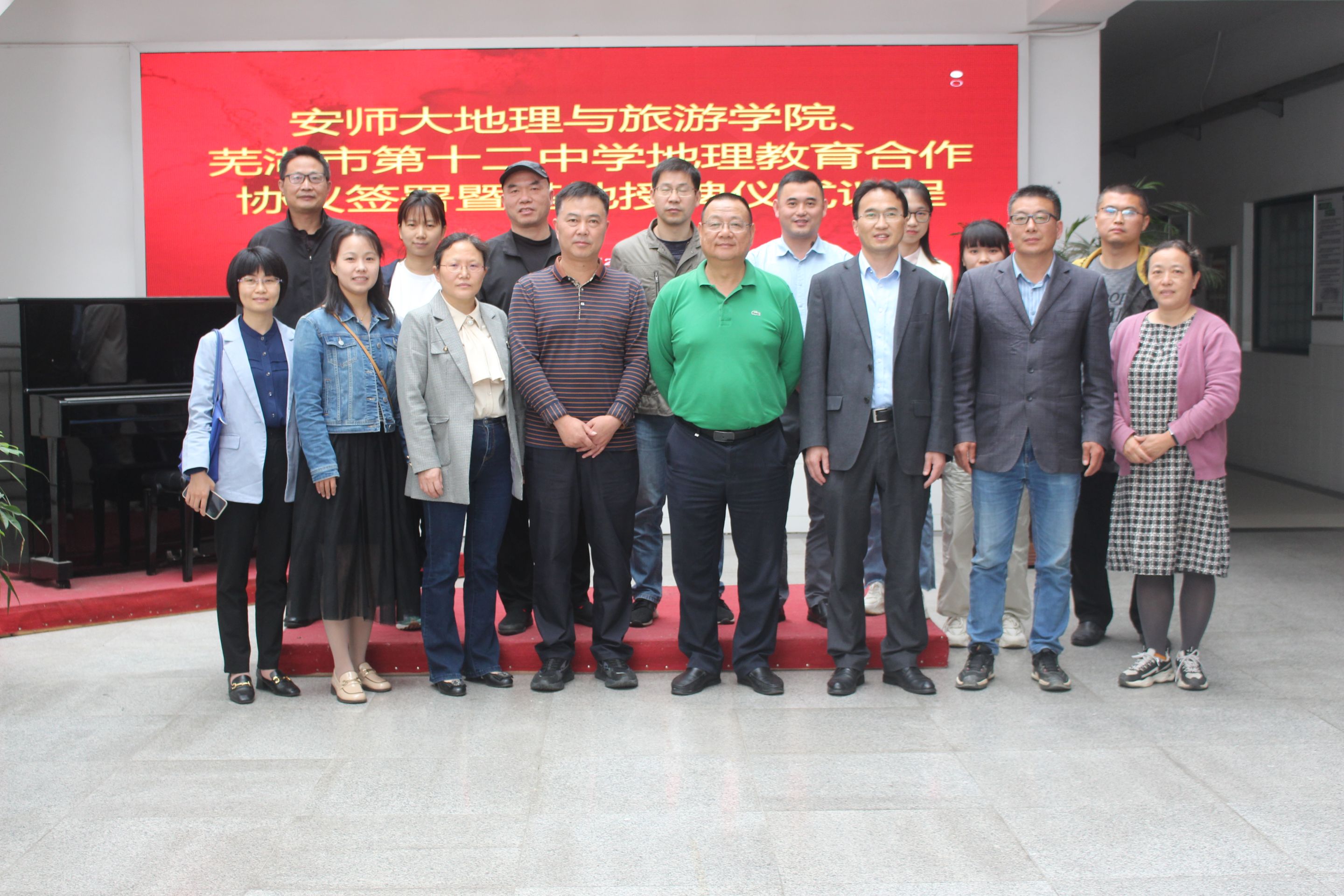 院长方凤满教授、副院长杨兴柱教授、地理科学专业负责人朱永恒教授、徐仪红教授、辅导员操晶晶一行赴芜湖市第十二中学就共建地理学科师范生实习实训示范基地、加强师范生培养等事项进行交流探讨,并举行实习实训示范基地授牌仪式。芜湖市第十二中学校长查海曼、副校长唐棣、教务处副主任刘峰、地理教研组组长张燕、教师马其虎、王小倩等出席,仪式由刘峰主持。