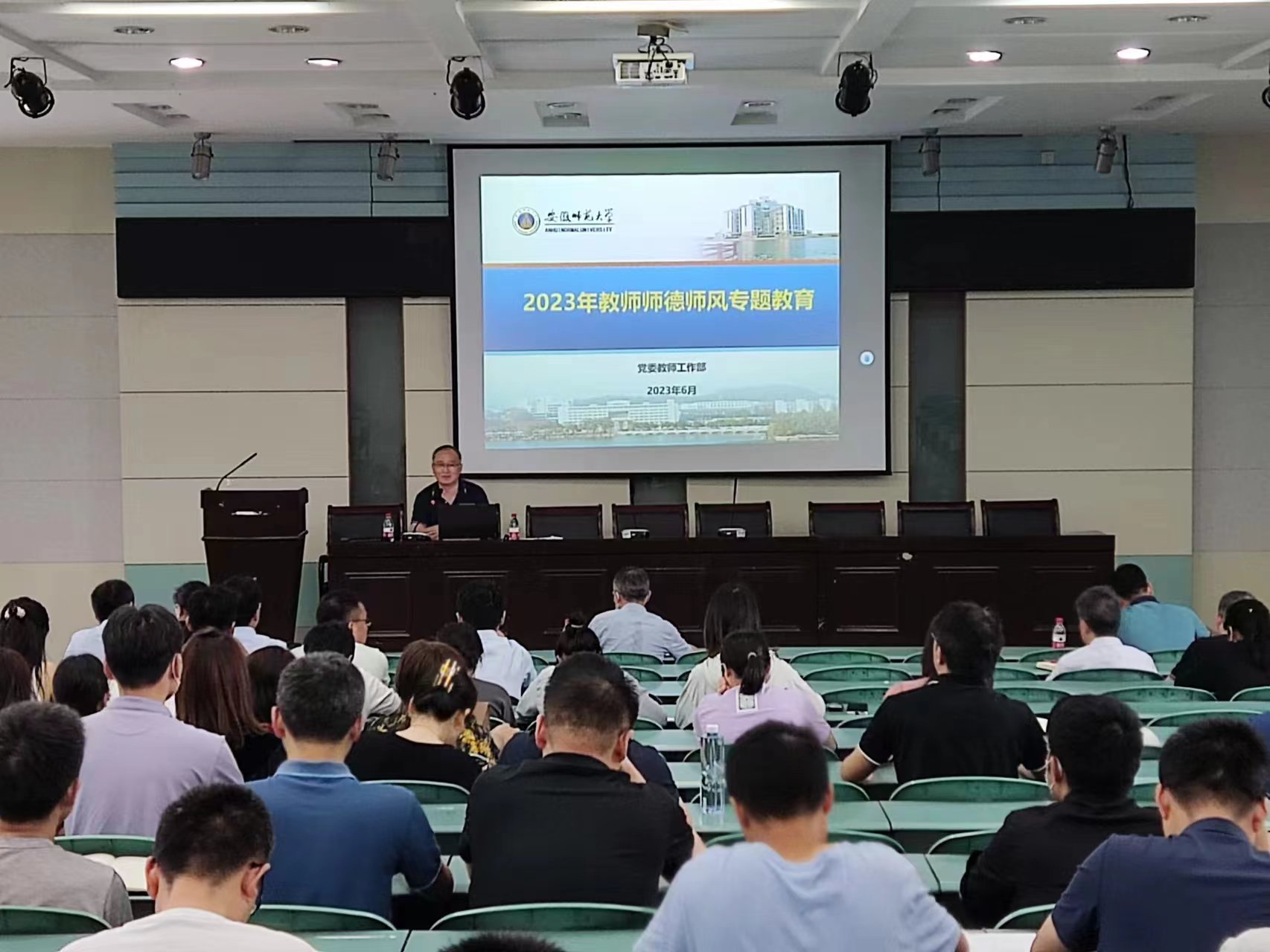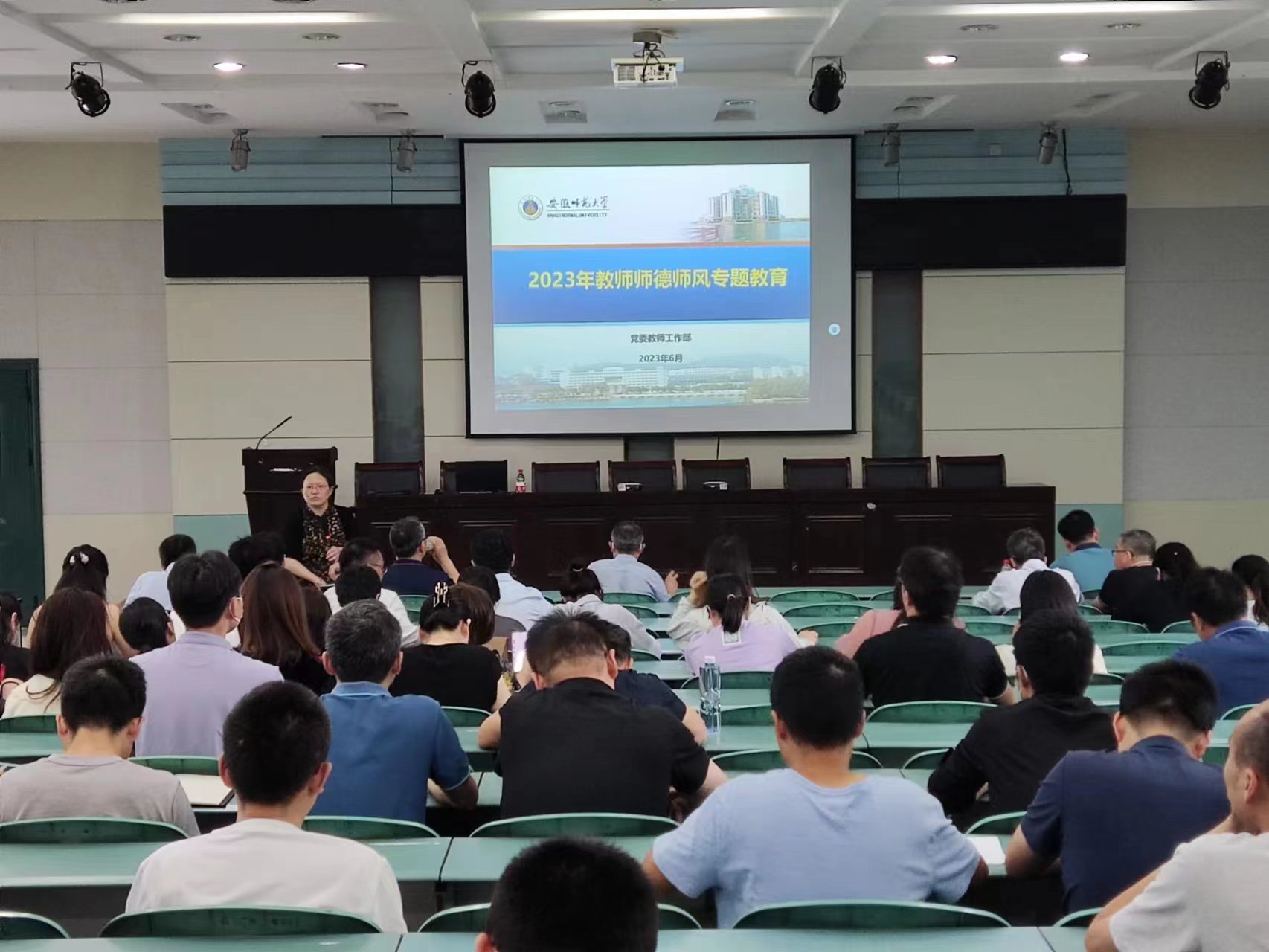 在院实验楼101报告厅召开全院教职工大会暨师德师风专题教育。校人事处副处长王标受邀作2023年教师师德师风专题报告,院长方凤满主持,学院全体教职工参加。