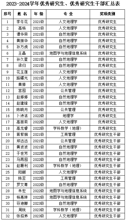 根据《关于做好2023-2024学年研究生先进个人评选工作的通知》(校研工部〔2024〕3号)等文件精神和要求,学院在坚持公开、公正、公平原则的基础上,通过本人申请、民主评议、研究生工作办公室提出初步人选、学院审核推荐等程序,现确定学院2023-2024学年优秀研究生及优秀研究生干部拟推荐名单。现公示如下: