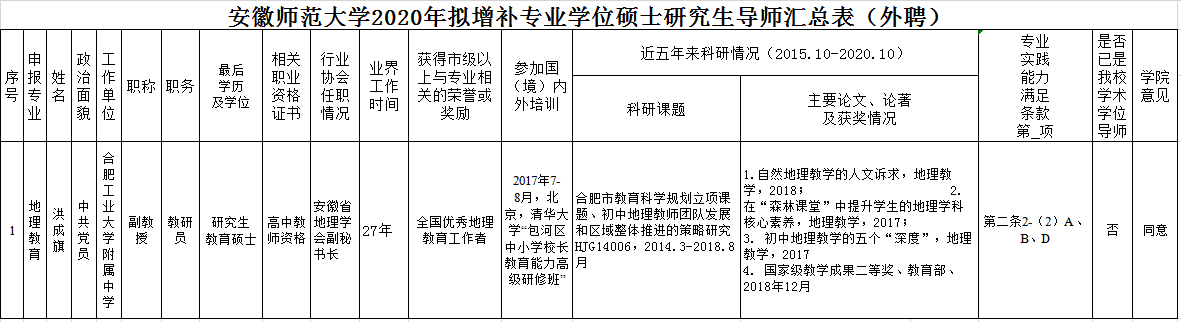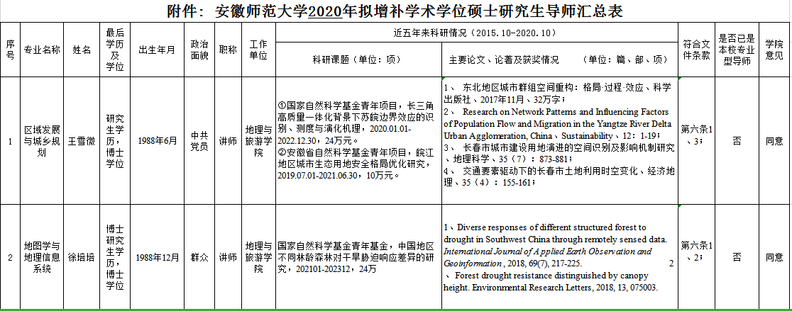 根据校研究生院《关于开展2020年度硕士研究生导师增补工作的通知》(校研字 (2020) 32号)和《安徽师范大学学术学位研究生指导教师遴选办法》(校学位字 (2019) 12号)等文件的精神和要求,学院在坚持公开、公正、公平原则的基础上,通过个人申请和学院教授委员会评审,现确定学院2020年拟增补硕士研究生导师名单。现将名单子以公示。