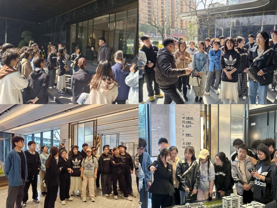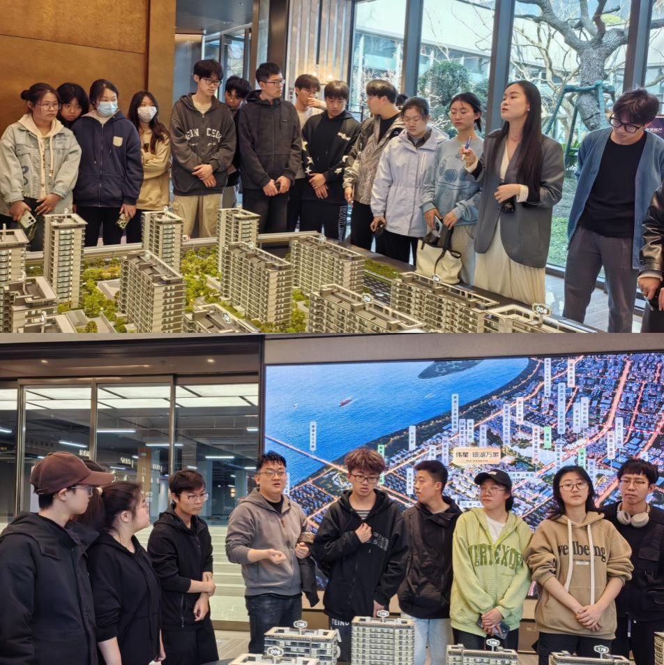 “以眼为笔记录小区风华。”首先来到的是芜湖伟星银湖万象售楼中心。项目负责人李勇带领同学们从大门开始,由外到内,逐步深入了解银湖万象项目。营销部任经理结合沙盘模型给同学们详细介绍了银湖万象项目的区位条件、周边情况、设计理念、建筑布局、道路规划等方面内容,同学们认真倾听,结合课堂所学知识,积极提出问题,任经理对同学们提出的问题做了详细的解答。姚景艳结合实际规划设计,带领同学们回顾了课堂所学知识,将理论与实践结合,深入贯彻知行合一的教育理念;结合同学们的作业,姚景艳从道路布局、商业选址、商业区服务对象等方面提出了作业中存在的问题,并给同学们提出了修改思路。项目负责人李勇详细阐述了小区内部的车流、人流方向,详细讲解了建筑选型相关知识,让同学们对居住区规划有了更深的领悟。