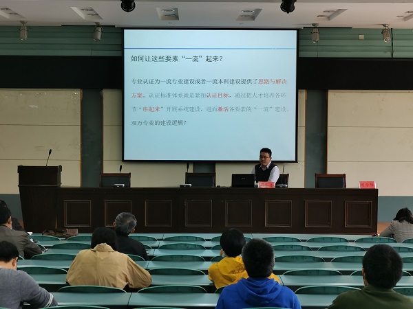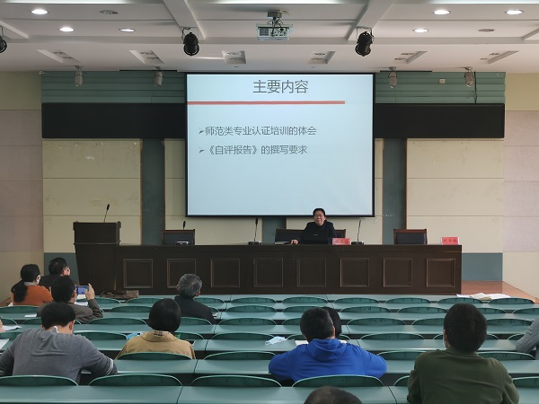 刘学梅教授指出专业认证是事关学生利益、专业生存、专业声誉和专业发展的大事,国家、社会和学校都高度重视,也是师范专业规范建设和内涵式发展的机遇;并详细解读了教育部《师范类专业认证自评报告》的撰写要求,逐项分析了师范类专业评估指标体系的内涵。