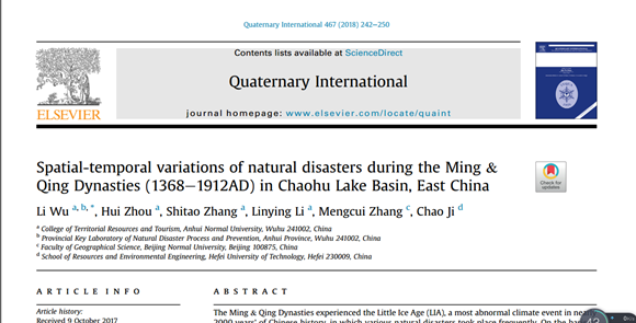 《Quaternary International》是国际第四纪研究联合会官方主办的权威刊物,目前被SCI和A&HCI等收录。国际第四纪研究联合会(INQUA)是第四纪地质学研究领域的一个重要国际学术组织,成立于1928年,旨在推进全球第四纪研究,为该领域科学家提供学术交流平台。本文研究成果详见:Li Wu, Hui Zhou, Shitao Zhang, Linying Li, Mengcui Zhang, Chao Ji. Spatial-temporal variations of natural disasters during the Ming & Qing Dynasties (1368-1912AD) in Chaohu Lake Basin, East China. Quaternary International, 2018, 467: 242-250. 论文下载链接://www.researchgate.net/publication/322912539_Spatial-temporal_variations_of_natural_disasters_during_the_Ming_Qing_Dynasties_1368-1912AD_in_Chaohu_Lake_Basin_East_China