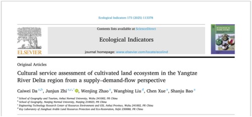 本科生在生态学领域国际知名期刊《Ecological Indicators》(影响因子7.0,中科院大类分区一区,期刊分类A5)发表论文“Cultural service assessment of cultivated land ecosystem in the Yangtze River Delta region from a supply–demand-flow perspective”。该文结合地理信息与农业大数据,基于“供-需-流”视角对长三角地区的耕地生态系统文化服务进行了系统评估并揭示了其时空分布模式,研究结果可为耕地资源保护与利用及其政策制定提供参考。2020级地理信息科学专业本科生答采薇和2021级地理信息科学专业本科生薛晨分别为论文的第一作者和第五作者,支俊俊副教授为论文的通讯作者。研究得到了国家自然科学基金(42271060、42371249)、安徽省自然科学基金(2208085MD91)、安徽省自然资源科技项目(2023-K-5)和安徽省高等学校省级质量工程项目(2023zybj006)的共同资助。