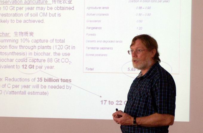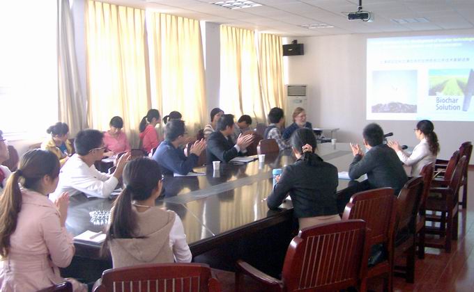 David Crowley教授根据自己近期的研究成果作了题为“Recent advances in the development of biochar technologies for carbon sequestration and land restoration”(土壤碳固定和土壤改良的生物质炭应用技术最新进展)的学术报告。报告中提及的生物质炭是当前土壤科学界研究热点和前沿,David Crowley教授从生物质炭研究背景、生产过程、性质到生物质炭利用对土壤的利弊方面作了详细的讲解,整场报告内容丰富、图文并茂,深入浅出。会后,Crowley教授与教师和研究生进行了互动交流,并细致耐心地解答提问。