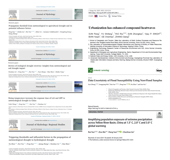 孙鹏教授团队联合得克萨斯农工大学、北京师范大学、中国地质大学等国内外知名高校,在气候变化生态效应与极端气候事件成因研究领域取得进展。2025年以来团队累计发表高水平学术论文8篇,其中5篇发表于安师大A5类核心期刊,2篇成果发表于水文学领域国际著名期刊《Journal of Hydrology》(中科院一区Top,IF:6.4)。研究系统量化中国不同下垫面类型区气象-农业干旱的传播阈值,精准解析生态干旱恢复动态的主导机制,确定LAI、GPP植被指标对干旱的响应时间;揭示长三角城市群城市化对昼夜差异化热浪的强化规律并预估了不同温升情景下的人口暴露度影响,为应对气候变化提供了重要科学依据。