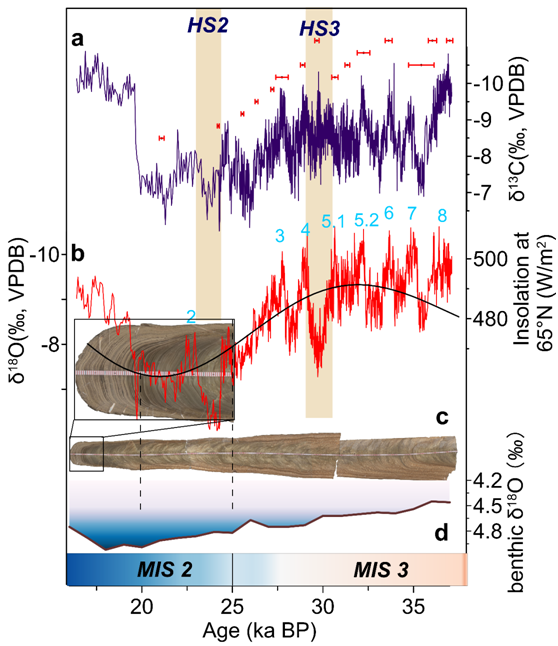 本研究基于生长于37.11-16.40 ka BP的湖北永兴洞的高分辨石笋(YX350) δ18O和δ13C记录,研究发现石笋YX350 δ18O记录的HS3持续时间(30.64 - 29.14 ka BP)与东亚夏季风区已发表的洞穴记录(30.78-28.74 ka BP)基本一致,其转型过程呈现缓慢的变化特征,这种缓慢的转型特征更类似于低纬和南半球的变化,不同于格陵兰冰芯记录的突变。此外,石笋的δ13C在HS3期间相对偏轻,指示该时期区域水文条件并未出现显著恶化。已有研究表明,来自哈德逊海峡(Hudson Strait)的超过2.5 sv (1 Sv = 106 m3/s)的融水携带着冰山,在南下的拉布拉多洋流的作用下,直接进入副热带北大西洋,绕过了北大西洋深水形成区和 “Ruddiment带”(40°-55°N)。因此,该融水事件对低纬度地区的影响相对有限,长江流域的区域水文和生态状况没有出现显著恶化。