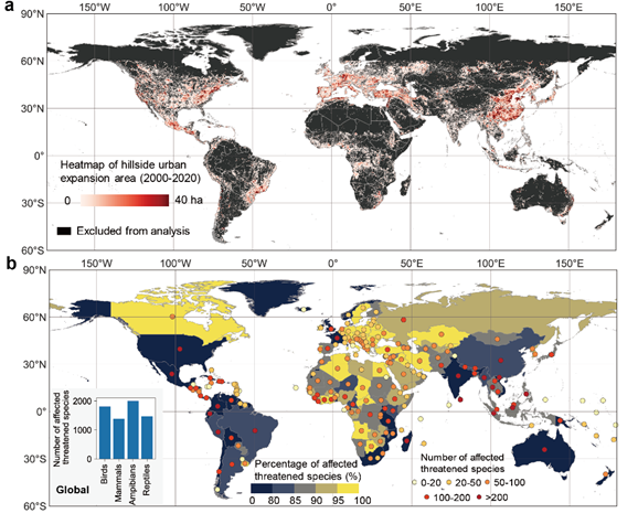 该研究融合夜光遥感等高分辨率遥感与物种分布数据,构建智能机器学习模型,在全球范围内首次系统评估了近20年城市爬坡对自然栖息地丧失、破碎化以及濒危物种生存危机的深远影响。研究发现,过去20年间全球城市爬坡面积达1165万公顷,其中35%发生在仅占全球陆地面积2.4%的生物多样性热点区内,导致673万公顷自然栖息地丧失,直接影响超过70%的濒危脊椎动物物种。研究预测,至2050年,全球将有53个国家无法实现中度生物多样性保护目标,69%的生物多样性热点区可能未能达到保护里程碑。这一研究成果不仅响应了联合国可持续发展目标(SDG11和SDG15)及“昆明—蒙特利尔全球生物多样性框架”的迫切需求,也为高生态敏感区域的国土空间规划和生态保护政策制定提供了数据支撑和决策参考。