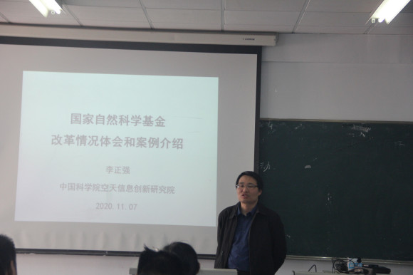 实验楼203教室,我校特聘教授、中国科学院空天信息创新研究院李正强研究员应邀就2021年度国家自然科学基金项目申报工作进行指导交流。学院部分领导和基金申报教师参加了交流会。会议由学院副院长方凤满主持。