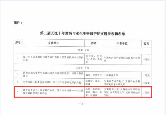 在2022年3月结束的第二届“长江十年禁渔与水生生物保护”有奖征文活动中,杨钊教授领衔的调研成果《激发内生动力,顺应转产心理,导入市场力量——长江流域安徽段禁渔经验总结》荣获二等奖、《长江流域安徽段退捕渔民可持续生计调研报告》荣获鼓励奖。2023年4月21日,农业农村部长江办、农业农村部长江水域生态保护战略研究中心、湖北省长江生态保护基金会和中关村国科现代农业产业科技创新研究院等4家单位在上海举办第二届“长江十年禁渔与水生生物保护”有奖征文获奖作者交流研讨活动,杨钊教授受邀参加并接受颁奖表彰,同时作为唯一一个以退捕渔民可持续生计为研究主题的征文作者就长江流域安徽段退捕渔民生计现状及变化、禁渔经验总结、就业转产典型案例、问题与趋势研判、可持续生计长效对策与建议等内容进行了交流汇报,调研及其成果获得了与会专家和领导的一致认可。