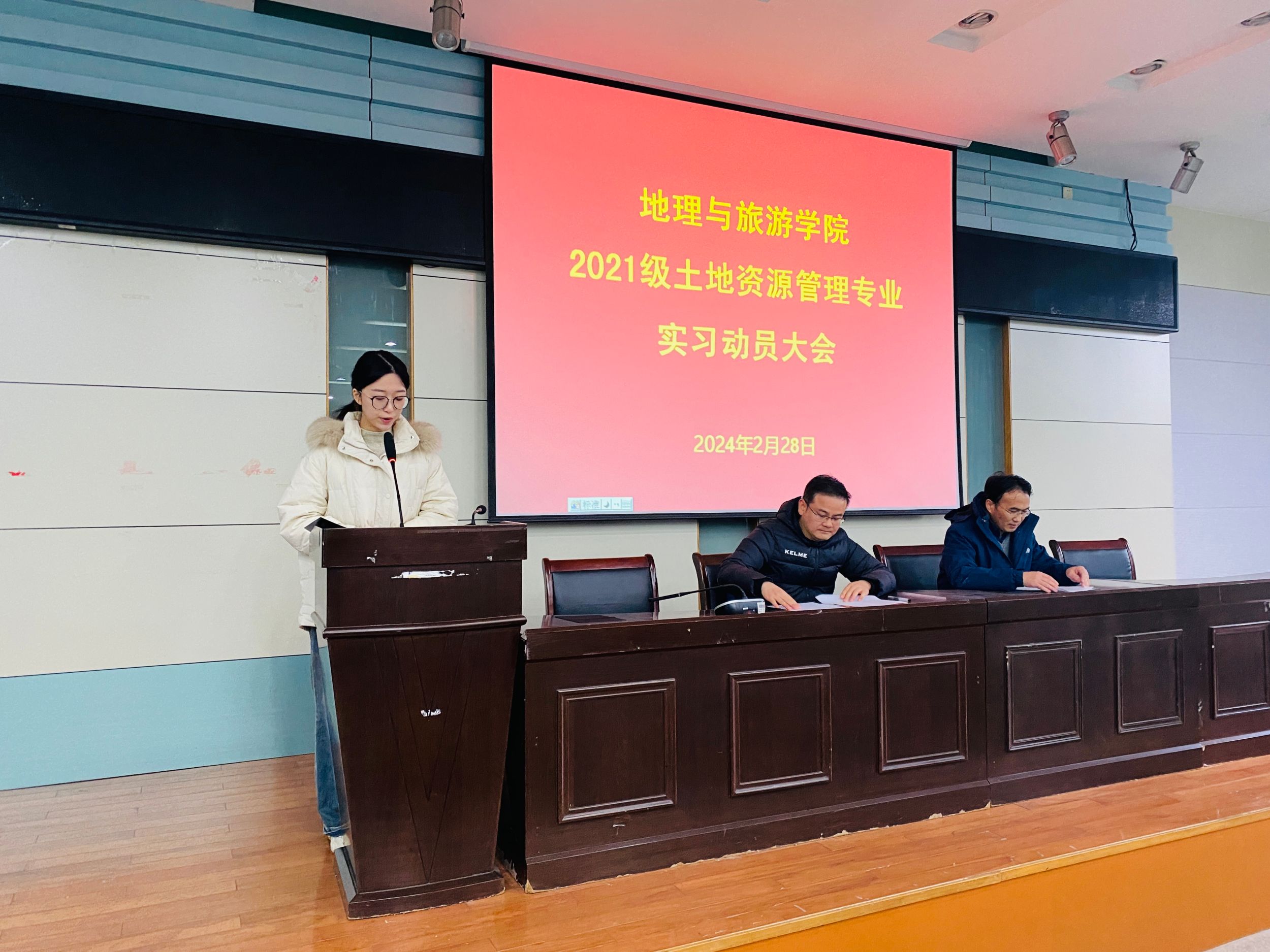101报告厅召开,学院党委副书记付勇、副院长杨兴柱、土地资源管理专业负责人费罗成、全体实习指导老师、辅导员吴文涵及2021级土地资源管理专业全体学生参会,会议由实习秘书张运主持。