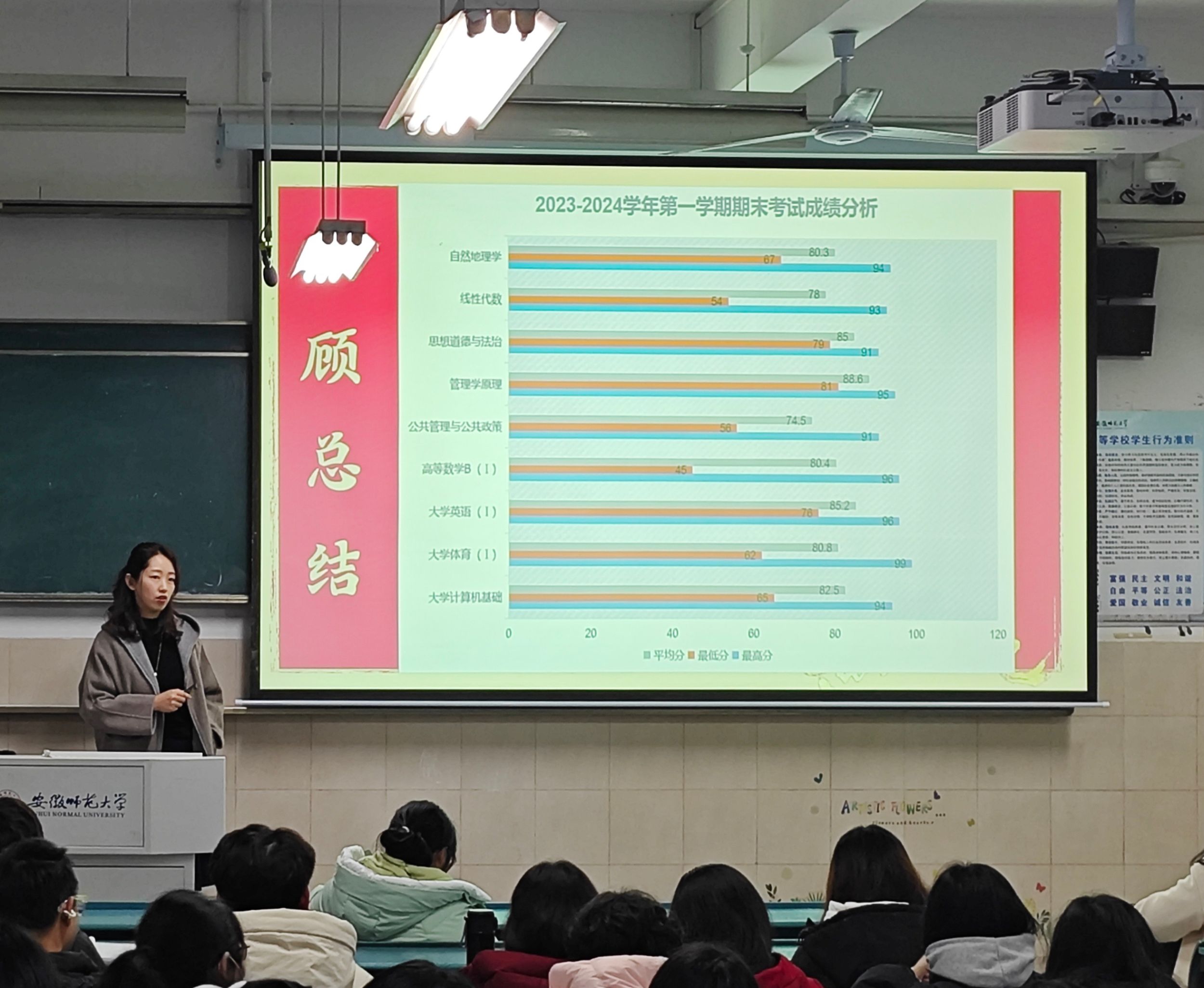 随后,李老师以图表的形式分析了各班上一学期期末考试成绩情况,督促大家回顾过往、主动收心,并在新学期制定新目标、新计划,重新规划接下来的学习和生活;希望同学们放开想、仔细听、大声说、规范做,养成课前预习、课中积极、课后复习的好习惯;鼓励同学们走出寝室,积极参加户外活动,锻炼身体、加强沟通交往能力。