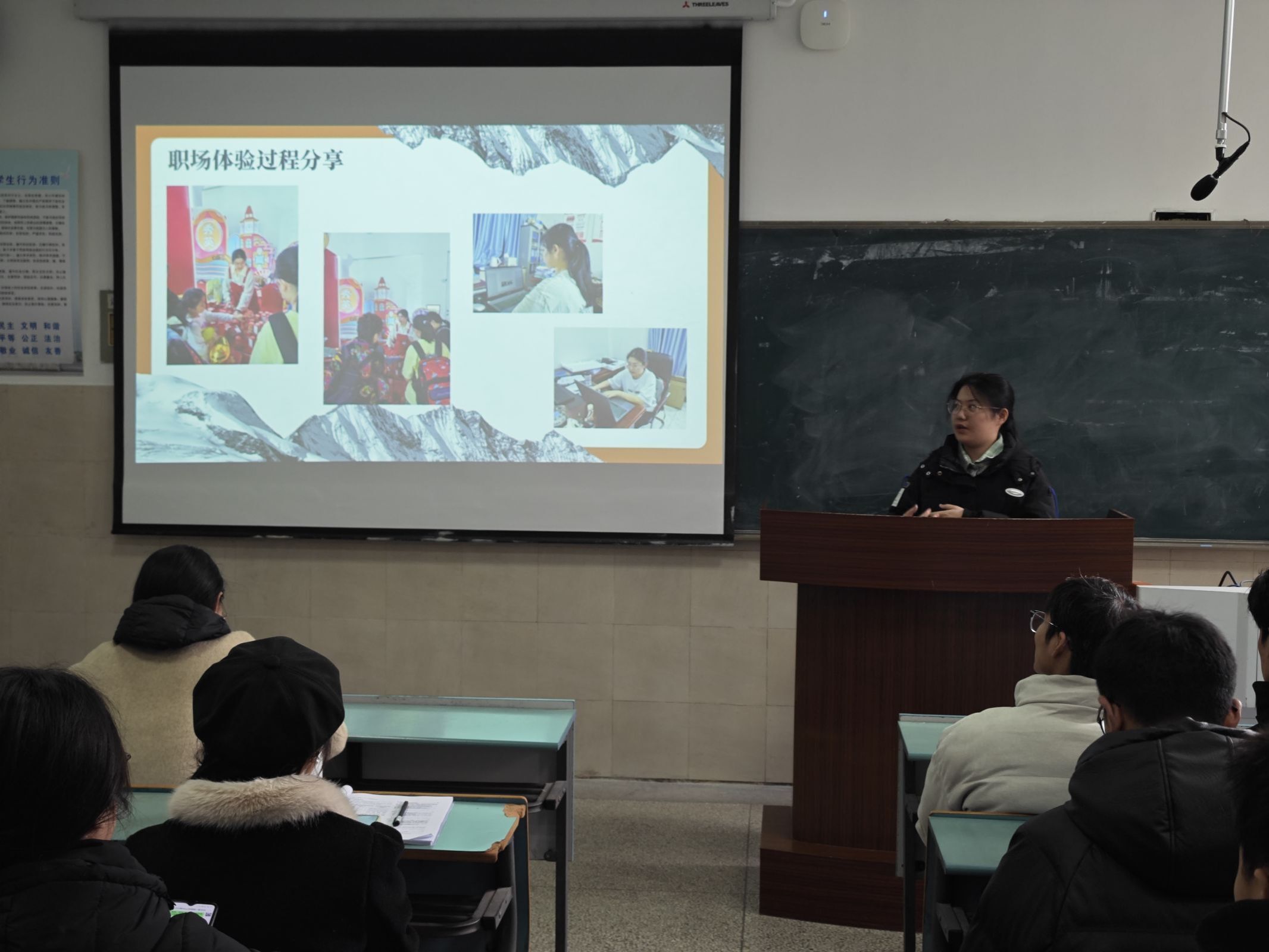“挺膺担当,‘职’面未来”。王冰冰、许毅俊同学分享了自己在地方政府当实习生的故事,体验职场的同时积极为人民服务,助力家乡发展,让同学们看到了当代青年服务人民、回报家乡的责任感与使命感。