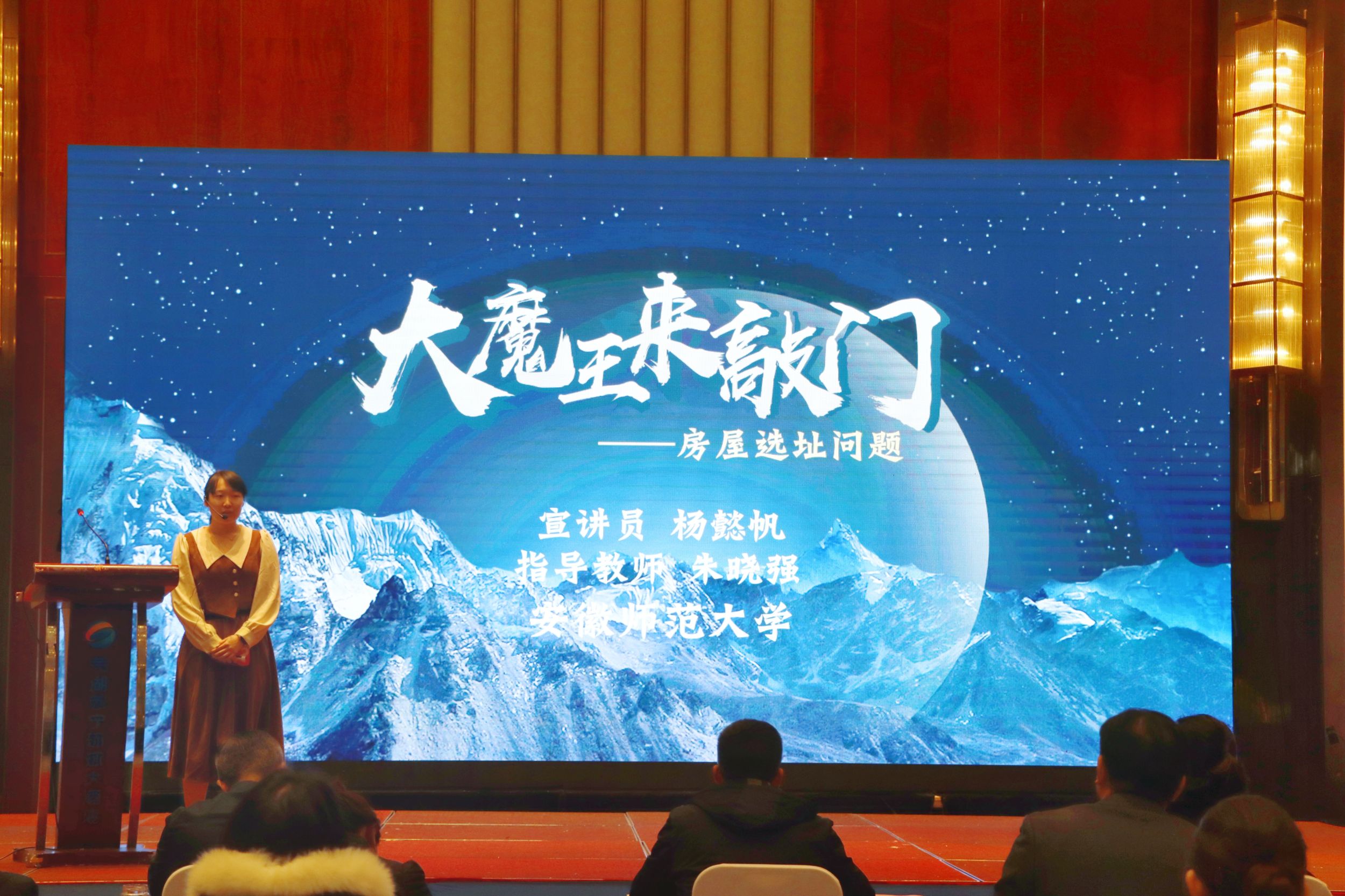 三位学生中,首先亮相的是2号选手杨懿帆。她以“大魔王来敲门——房屋选址问题”为主题,从大学生寒假的日常话题入手,巧妙地引出“房屋选址”议题,进而深入探讨了“房屋因地震而损毁”的中心话题。她运用扎实的专业知识,从地震的定义、形成原因,以及建房时的应对手段等多个维度,深入浅出地阐述了房屋选址与地震之间的紧密关系。最后,她以敬畏大自然、与大自然和谐共处的理念作为结尾,强调这才是实现永续文明的必由之路。