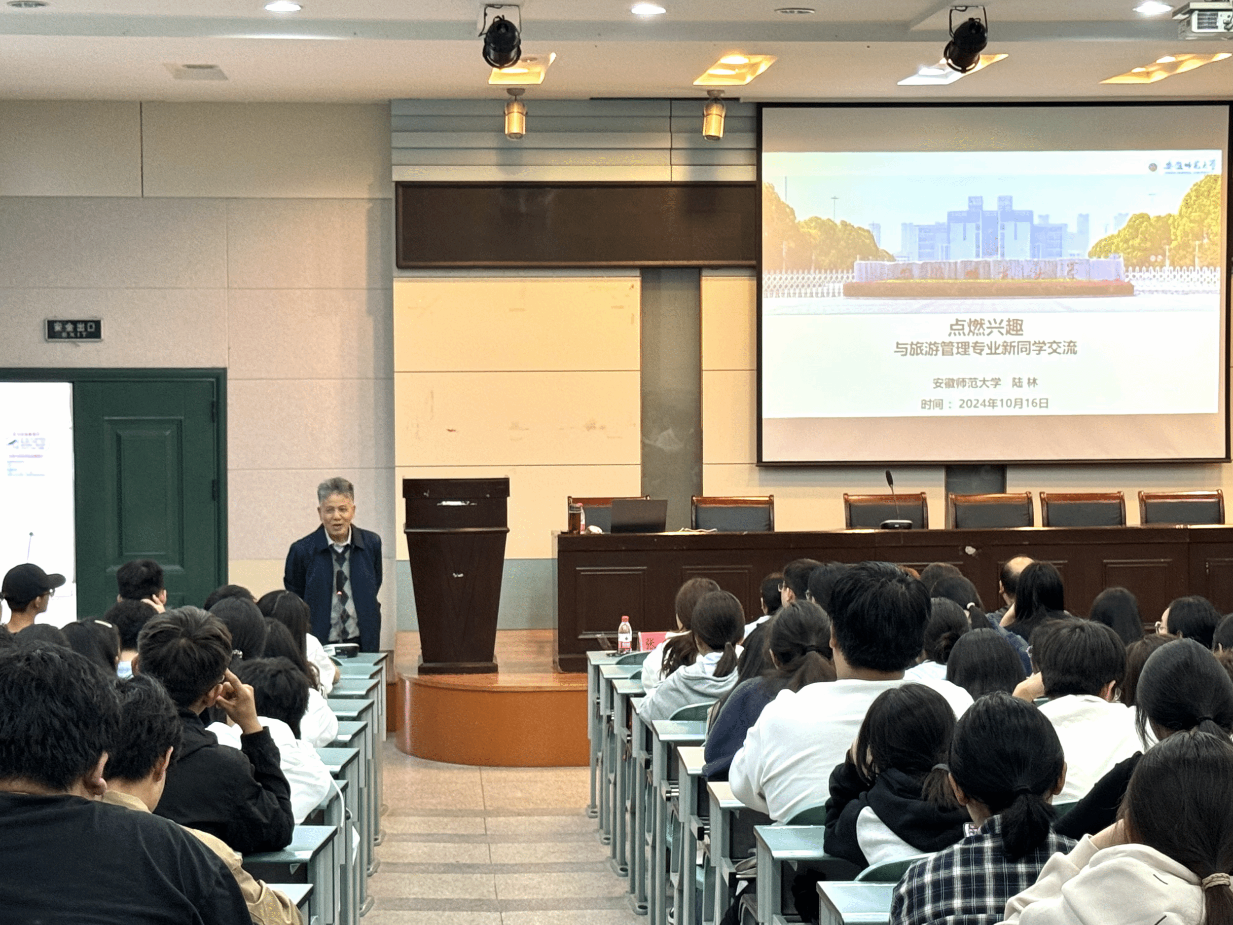 原副校长陆林教授以“点燃兴趣”为主题给同学带来了一场精彩纷呈的讲座。陆林以生动的案例,从新时代、硬实力、软实力、价值共创四个方面深入浅出地剖析了旅游管理专业具备的优势与发展前景,强调我们正处于一个高质量发展的新时代,广大青年要争做有理想、敢担当、能吃苦、肯奋斗的新时代好青年,在推进强国建设、民族复兴伟业中展现青春作为、彰显青春风采、贡献青春力量,奋力书写为中国式现代化挺膺担当的青春篇章。