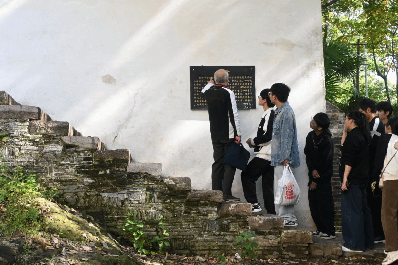 陈仁均教授带领大家参观了赭山校区。校园内古树参天,水杉高耸入云,樟树粗壮有力,这些树木大多有着70年以上的树龄,是安师大和芜湖市共同保护的宝贵财富。陈仁均教授还亲自带领大家参观了五四学堂、皖江中学堂、司令部旧址等具有历史意义的建筑和场所,让大家深刻感受到了学校的历史底蕴和文化内涵。最后一站是山顶的皖江中学堂,91岁的陈仁均教授身子骨硬朗,拒绝搀扶,走在队伍前列。山林葱郁,宁静祥和,同学们与教授结伴同行,尽显尊师重道之风范。