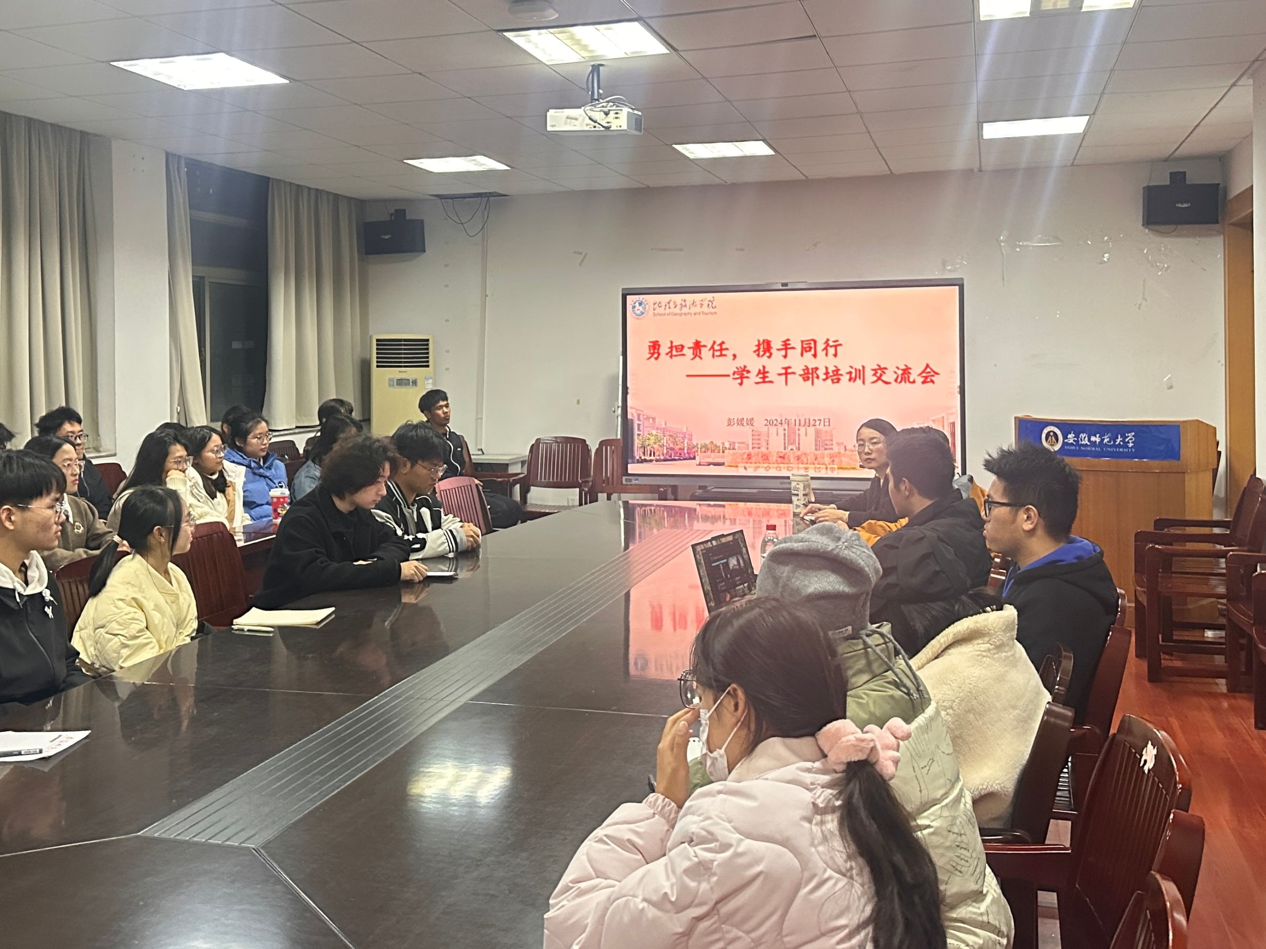 在行政楼三楼会议室组织召开学生干部交流培训会,本次会议由辅导员彭媛媛主持,2024级地理科学(师范)、城乡规划、土地资源管理专业各班班委参加。