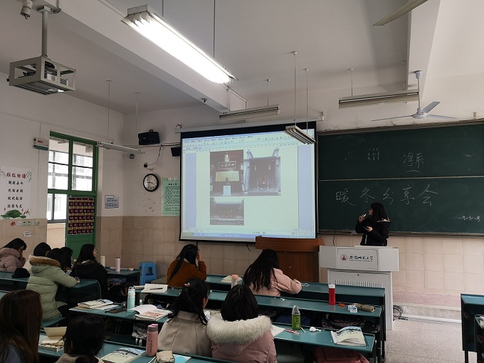 首先,蔡雯、陈慧同学介绍了各自家乡的文化名人——赵朴初、吴敬梓,两位同学以寻访故居、纪念馆的形式进行调研,为同学们展示馆内风景与陈设,让同学们了解到了佛教领袖及书法家赵朴初、《儒林外史》作者吴敬梓的生平成就。