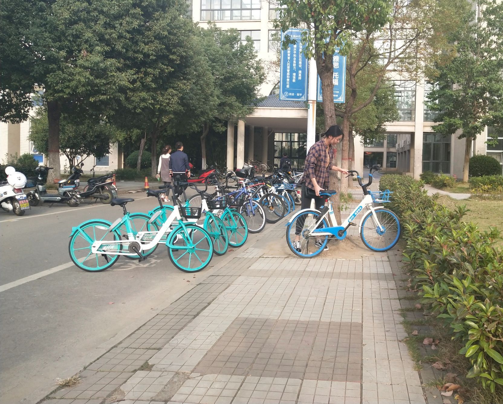 大家在整理车辆过程中还发现,有的单车上被贴上了“牛皮癣”,有的单车篮里堆放着塑料瓶,还有的单车的链条或是座椅都已损坏,看起来十分不美观,而且还影响同学们的正常租用和安全出行。大家纷纷动手清理这些垃圾来,不一会,单车里的垃圾就被清理的干干净净,对于那些受到破坏的车辆,大家也及时拿出手机报修。经过班级同学的共同努力,校园里的共享单车变得整整齐齐,焕然一新起来。