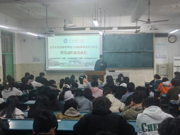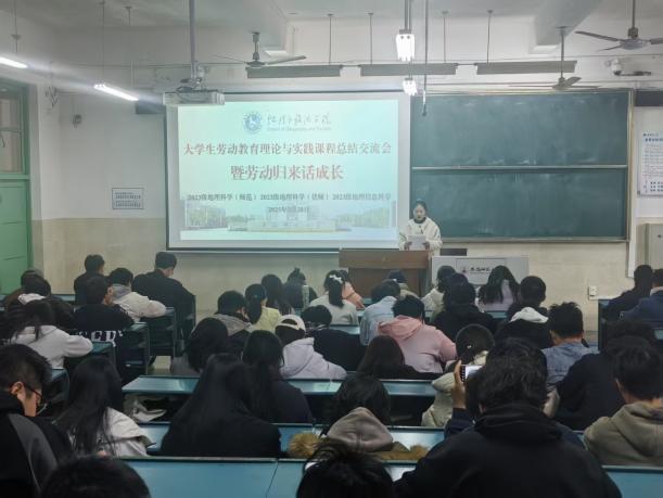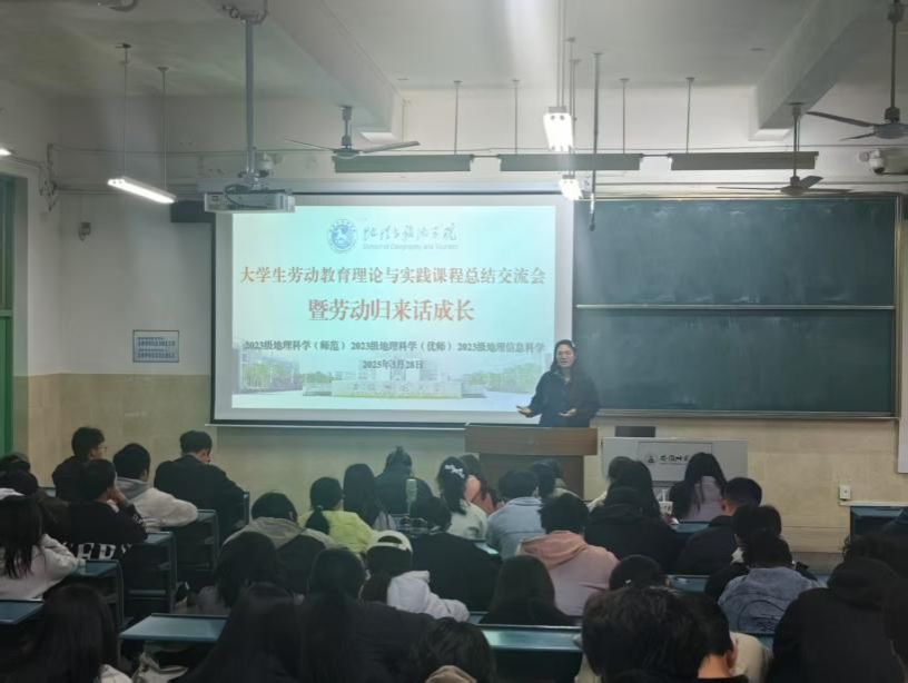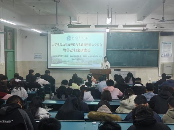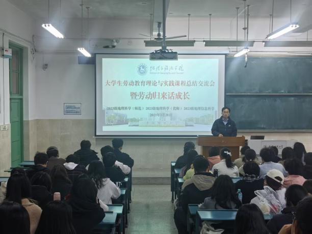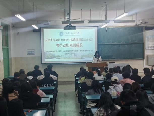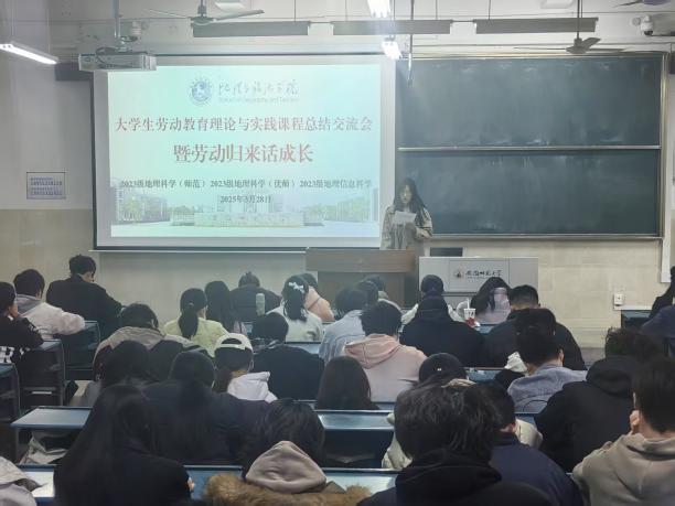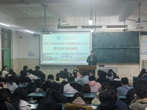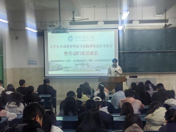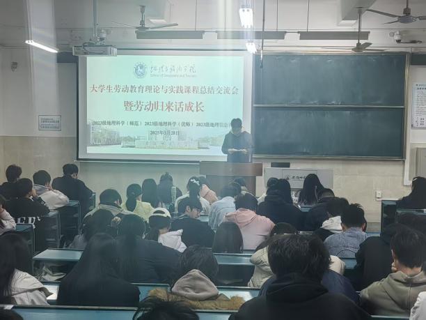 “大学生劳动教育理论与实践课程 —— 暨劳动归来话成长” 劳动周总结交流会。本次活动由学院辅导员齐小学和吴楠主持,2023 级地理科学(师范)、地理科学(优师)及地理信息科学专业全体同学参与,会议旨在总结本周的劳动周实践成果。