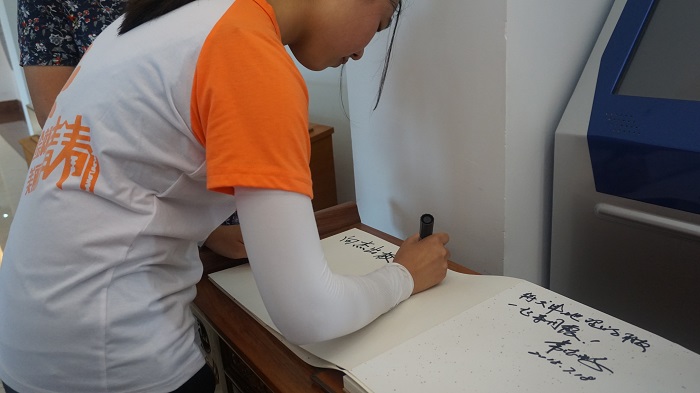 队员们到丹霞山的第一天就便瞻仰了丹霞山博物馆三楼——纪念彭华教授主题展览。展板前,队员们缓缓移动着步伐,静默不语,一块又一块,泪水在眼眶中打转,脚步声也变得愈发低沉。彭华先生铜像前,久久凝视不愿离去,深深的为先生鞠了一躬,道不尽的思念与惋惜。团队指导老师吴立到丹霞山后没有立即与同学们会合而是去锦石岩寺下院怀缅彭华先生。“高山仰止,景行行止。丹山赤赤,锦江泱泱,先生之风,山高水长。”吴立动情地说。
