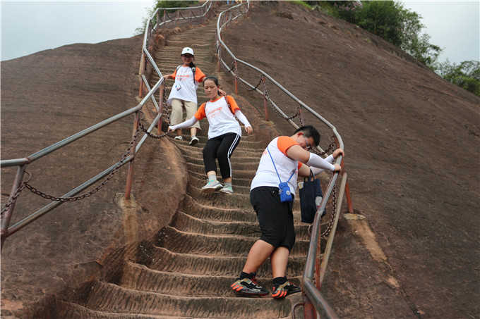经过短暂休整,下午2点,一行十五人继续前行,踏上阳元石-细美寨路线。沿着云崖栈道,团队很快到达阳元石观景台,“孤留一柱撑天地,俯视群山尽子孙”,大自然的鬼斧神工震撼到了每位队员。再攀阳元山便到达细美寨,细美寨三面悬崖峭壁,一面有石级可登,出山顶寨门下山尚有两道岗哨,扼上山之咽喉,地势异常险要,队员们齐心协力,克服天堑难关,拍照片,辨植物,领略了上午在博物馆所见所闻的各类奇观。在实地勘察中,队员们将理论联系实际,大大提高自己的专业素养,对丹霞有了更多的了解。