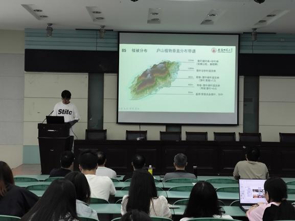 汇报以专业六个小组为单位依次进行。各小组围绕"庐山自然地理综合研究"主题,结合野外实地观测数据与影像记录,从地理概况、实习记录、实践感悟三大维度展开分享。各小组在汇报中系统呈现庐山自然地理特征并结合实测数据,阐述庐山作为282平方千米断块山的区位特征,对比九江市区与山区海拔1165.4米处的气象数据,印证年均119天雾日的湿润气候及“海拔每升100米气温降0.6℃”的垂直递减规律。通过对地质地貌的野外调研揭示,庐山受温泉与莲花洞大断裂控制形成断块山,北山“三背斜两向斜”褶皱构造经外力侵蚀造就“横看成岭侧成峰”景观,仙人洞等节理地貌展现内外力协同作用。对庐山植被土壤综合分析,构建垂直生态序列,从600米以下马尾松林到1100米以上落叶阔叶林,对应红壤至山地棕壤的土壤过渡,阐明海拔1320米处山地棕壤与植被的物质循环机制。气象观测则以5月26日九江与庐山温差10.2℃为例,揭示气温直减率受大气环流影响的动态特征,全面展现“地貌-气候-生态”的学科交叉研究价值。