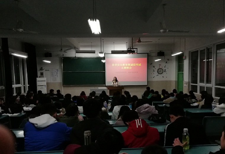 2017级地理信息科学、城乡规划专业于行知楼4号楼302教室开展“春季安全教育暨诚信考试”主题班会,会议由辅导员彭媛媛主持。