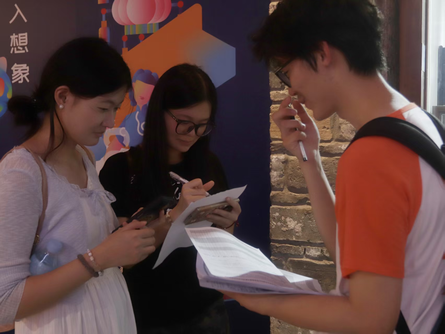 的学生,想耽误您几分钟时间做个调研,了解大家对芜湖古城的印象……”在徽派古宅前、在非遗工坊旁,队员们热情地向游客介绍调研目的,耐心讲解问卷内容。面对游客的疑问,他们结合专业知识细致解答。遇到填写不便的老人,便主动上前协助。烈日炎炎下,汗水浸湿了衣衫,但阻挡不了队员们始终专注而坚定的意志。他们用实际行动践行着“求真学问、练真本领”的青春誓言。