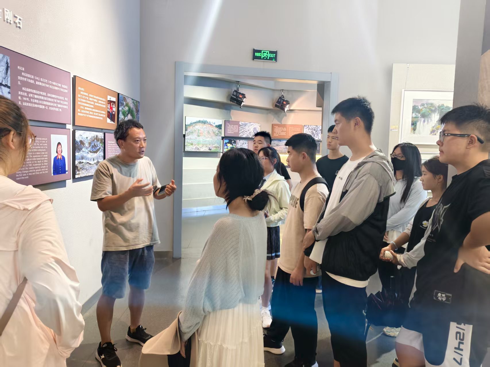 午餐过后,实践团队在杨立辉的组织下参观了天柱山博物馆。博物馆内陈列着大量珍贵的历史文物和丰富的文化资料,生动地展现了天柱山地区从古至今的发展历程和独特文化。在杨立辉的引导下,团队成员们依次参观了各个展厅,每一件展品都承载着一段历史,讲述着一个故事。队员们认真聆听讲解,不时发出惊叹,对天柱山地区深厚的历史文化底蕴表示由衷的敬佩。在地质文化展厅,队员们了解到天柱山独特的地质构造和丰富的自然资源。天柱山作为世界地质公园,其地质遗迹具有极高的科学价值和观赏价值。队员们通过观看地质模型和科普视频,深入了解了天柱山的形成过程和地质演变,感受到了大自然的神奇魅力。在标本展厅,队员们被一件件精致的标本深深吸引。从蝴蝶标本到昆虫标本,转角又是鸟类标本,有力地向我们展示了天柱山的生物多样性。