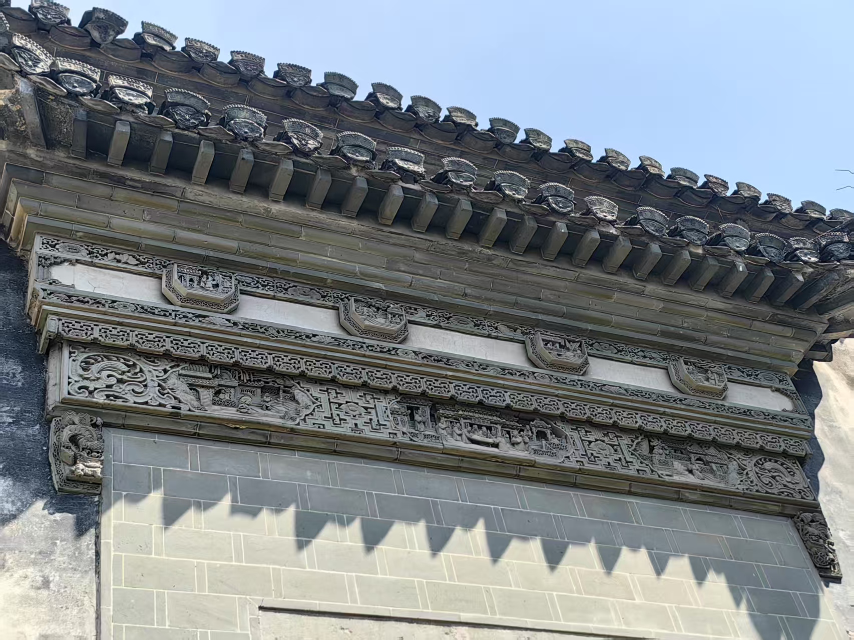 在介绍完木雕艺术后,汪书向书记将团队引领至另一处文化瑰宝前——“九世同堂”砖雕门楼。“这座门楼在徽州砖雕中极具盛名,是先人留给我们的无价之宝。” 汪书记言语中满是自豪。砖石虽小,却在工匠毫厘之间的精妙刀法下,于方寸之间彰显出震撼人心的艺术张力。在汪书记的生动讲述中,砖雕上的人物仿佛“活”了过来,队员们不仅读懂了砖雕“以小见大”的精湛技艺,更感受到先辈对美好生活的向往。