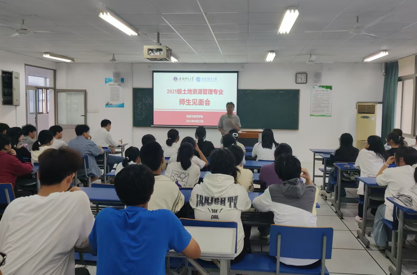 (本网讯 祁心怡)9月25日下午,2025级土地资源管理专业师生见面会在学院实验楼二楼203教室召开。学院副院长杨兴柱、土地资源管理专业负责人费罗成出席,2025级土地资源管理专业全体新生参会,会议由韩红豆主持。