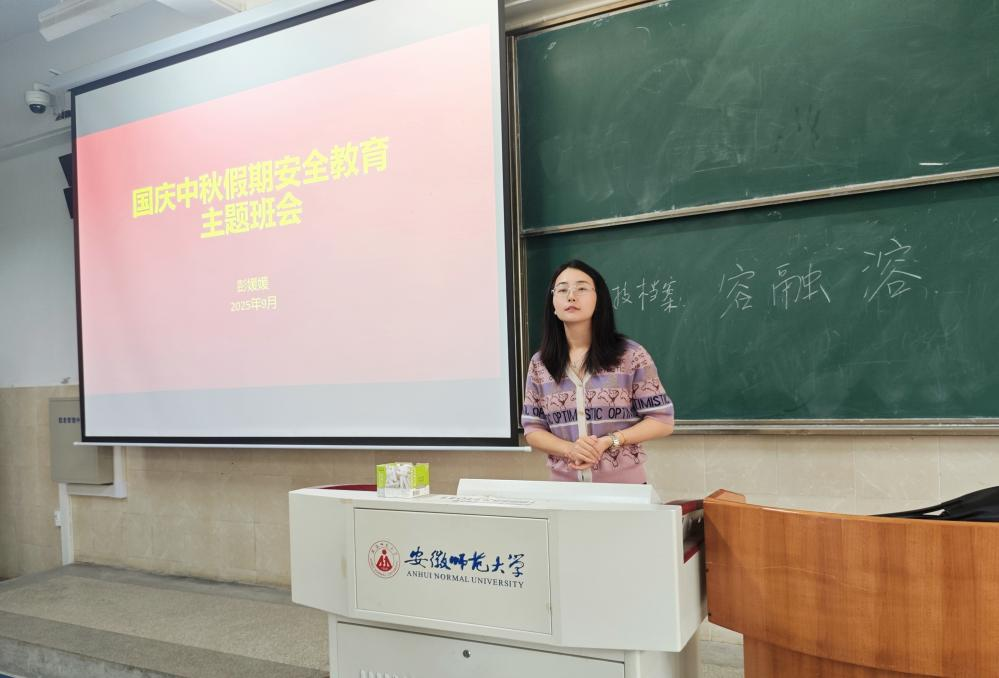 刘紫凤)为加强班级学风建设,做好国庆中秋假期安全教育工作,9月26日下午,2024级地理科学(师范)专业全体同学于行知楼召开主题班会,本次班会由辅导员彭媛媛主持。
