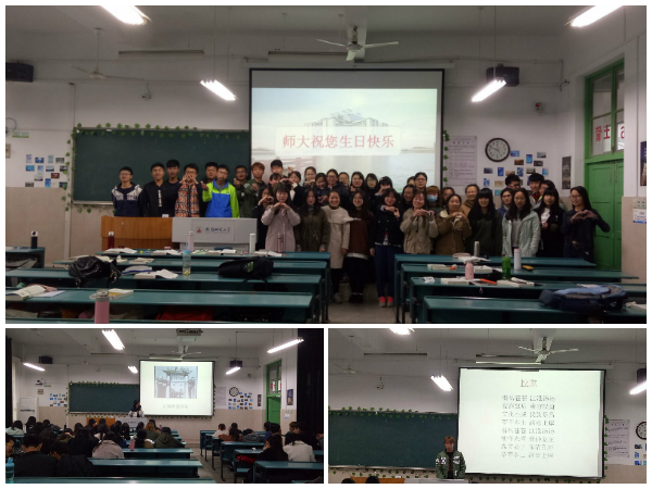 ,这一演变过程让同学们情不自禁地因作为师大的一份子而感到骄傲。在主持人的引领下,活动进入了第二个项目。班级歌唱小男神丁寅同学先带领大家复习了一遍校歌的演唱,待大家熟练的掌握了校歌的节奏之后,班级同学齐唱校歌,歌声悠扬洪亮,歌声满载着对师大的祝福之情。