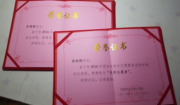 、安徽工程大学、皖南医学院等高校志愿公益协会举办的各类爱心活动。接着志华爱心团队副会长洪鹏飞发表了讲话并宣布2016年度志华爱心表彰大会开始。主持人宣布优秀志愿者名单,我校爱心者协会志愿者胡舒沁、秦秋明、汪慧、姚翠、张晓晓等10名志愿者上台接受表彰,荣获“优秀志愿者”称号。大会结束后,我校爱心者协会指导老师刘冠琪及优秀志愿者与程志华老师合影留念。