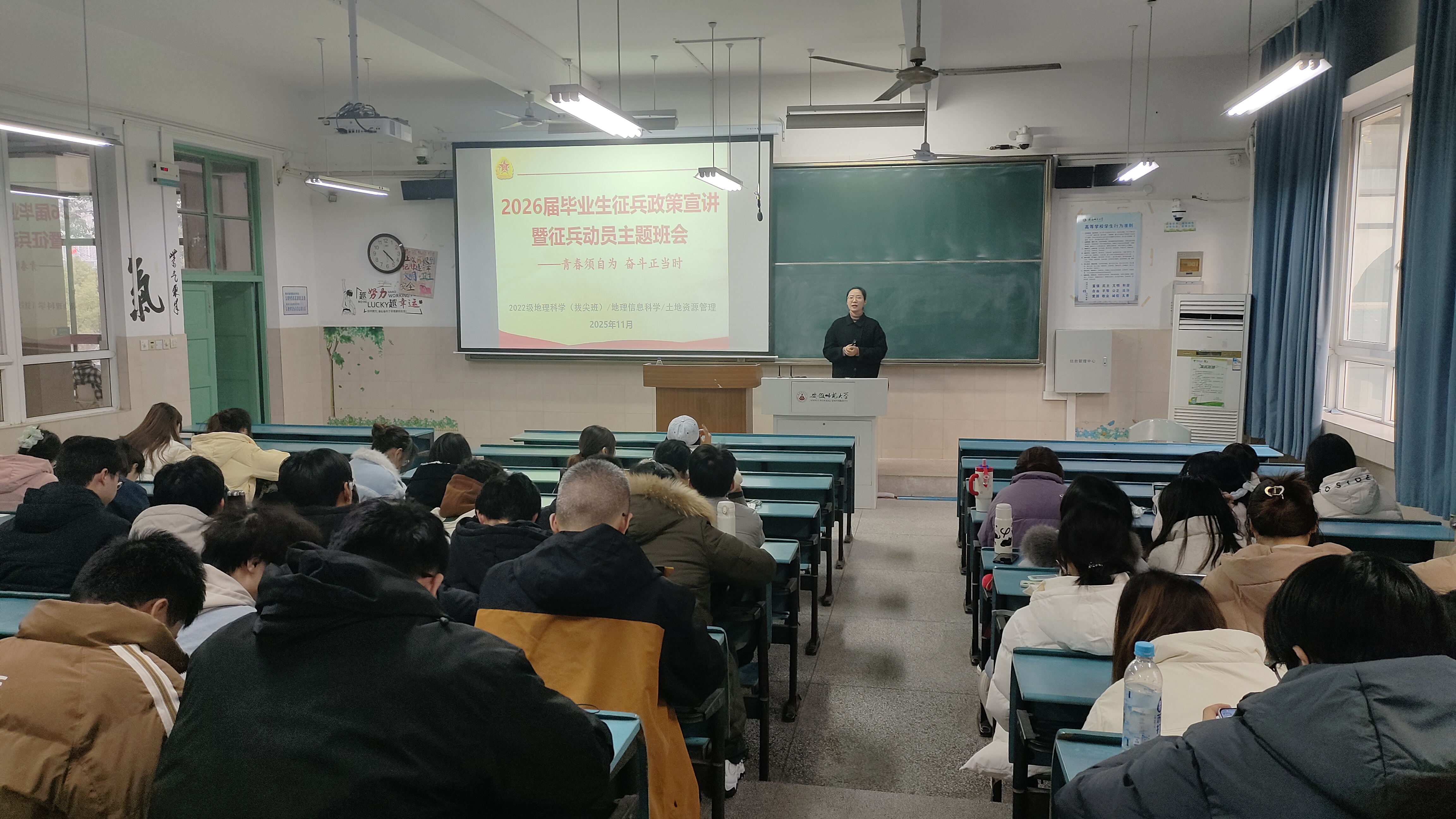 为鼓励2026届毕业生投身国防建设,2022级地理科学(拔尖班)、地理信息科学、土地资源管理专业举行毕业生征兵政策宣讲暨动员班会。班会由辅导员陈祥云主讲。