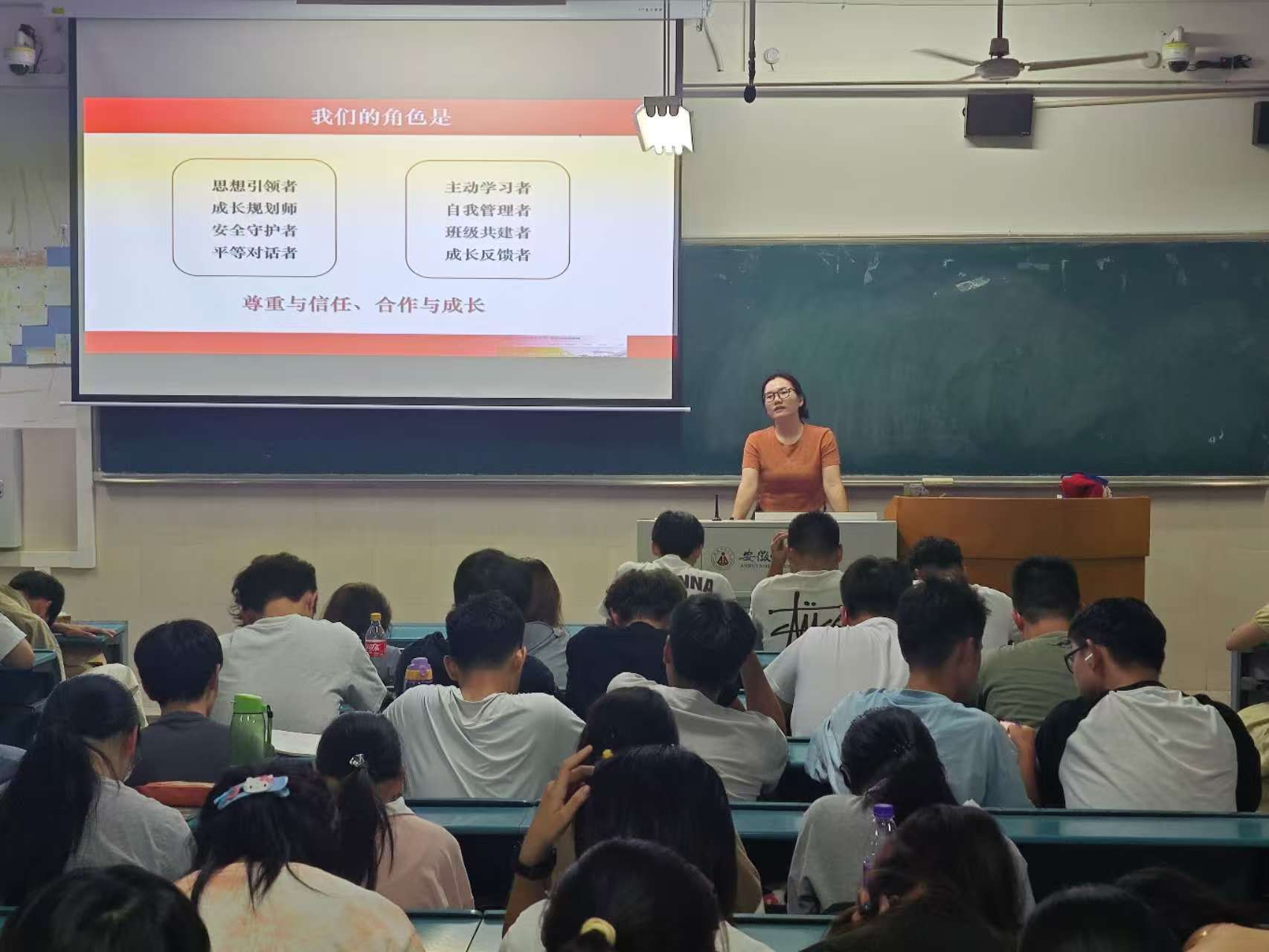 班会上,辅导员韦银艳首先进行了自我介绍,明确了工作职责与联系方式,强调了师生之间“尊重与信任、合作与成长”的互动关系。会议重点强调了学生日常管理的各项制度,包括规范的请销假流程、严格的晚点名与课堂考勤制度,以及严禁擅自离校、使用违规电器等宿舍管理“四项禁令”,旨在引导学生以纪律塑造优良品格。