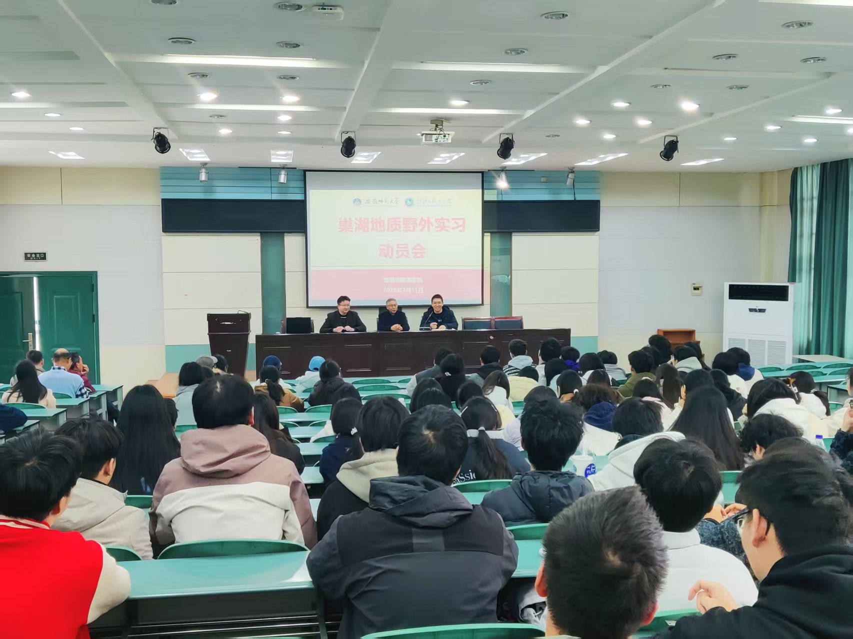 在学院实验楼101报告厅举行巢湖地质野外实习动员大会,学院党委副书记钱程,副院长孙鹏,实习指导教师程先富、吴立、杨立辉、朱晓强,以及2025级地理科学(师范)专业全体同学参加会议。