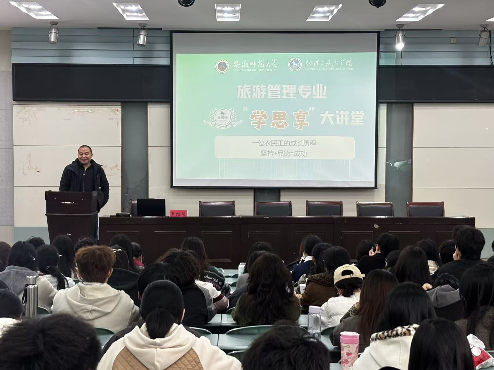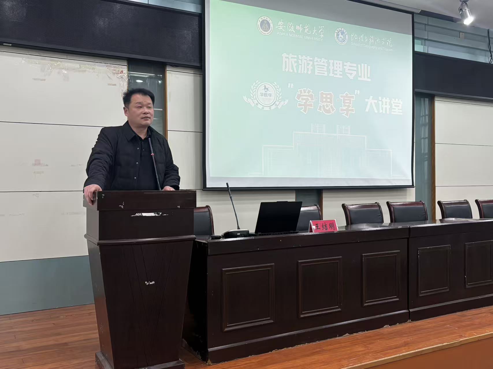 旅游管理专业在学院实验楼101报告厅举办“学·思·享”大讲堂主题分享会。活动特邀优秀企业家余姚市杰明喷雾器有限公司总经理王结明先生、宁波松茂包装有限公司总经理朱立松先生担任主讲嘉宾,与在场学子分享创业历程、人生感悟与职场心得。学院党委副书记钱程、旅游管理专业副主任张伟及2025级旅游管理专业全体本科生参加了本次活动。