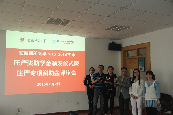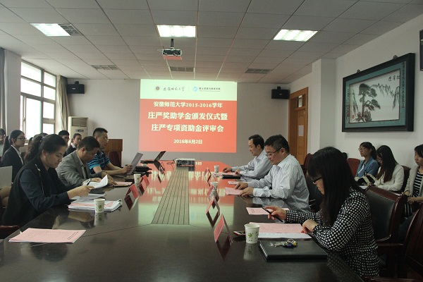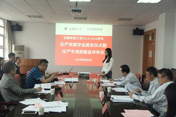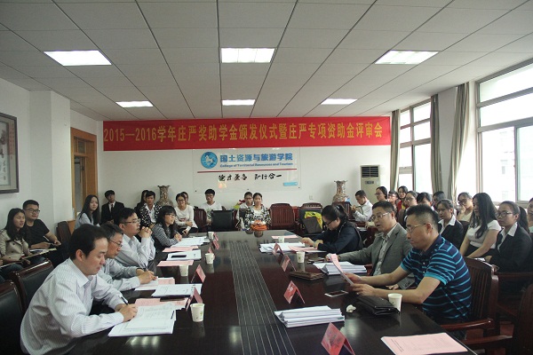 2015-2016学年庄严奖助学金颁发仪式暨庄严专项资助金评审会在国土资源与旅游学院行政楼三楼会议室举行。庄严基金会评审委员会委员吴斌、吴军,秘书长杨晶晶,国旅学院党委书记贾冠忠、院长苏勤、党委副书记乔静、副院长赵冬梅出席本次会议,全体专兼职辅导员、奖助学金受助学生代表及专项基金申报团队参加了会议,会议由乔静主持。