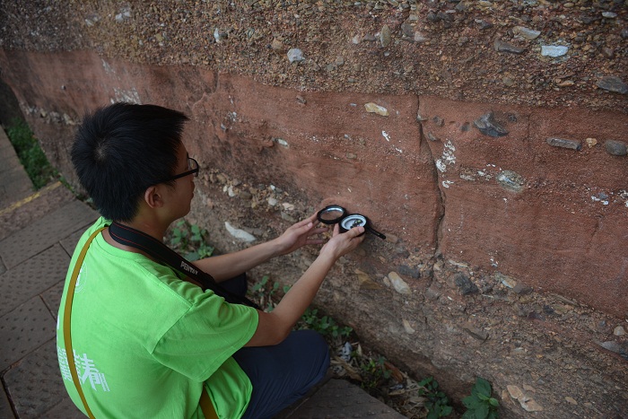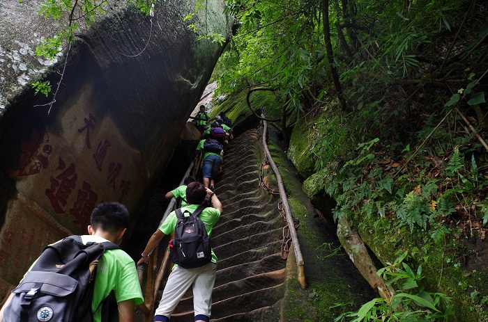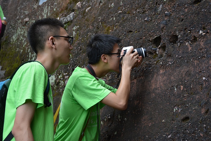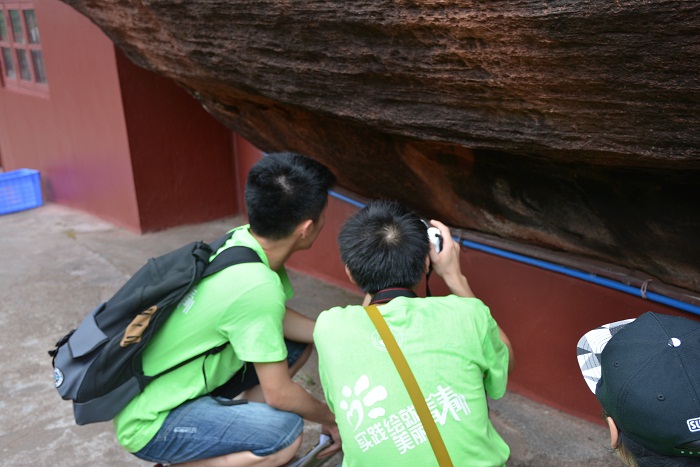 坚持攀行,终有回报。艳阳高照时,队员们汗流浃背,攀登70度几近垂直的山梯,观察蜂窝状地貌、龟裂填充岩契、卸荷节理地貌,在观日亭赏光。倾盆大雨时,队员们钻过1米多高的幽洞通天,眺望一线天,经过古沙坡,百丈岩。这一路上,队员们讨论、观察,对丹霞地貌有了更多的了解。