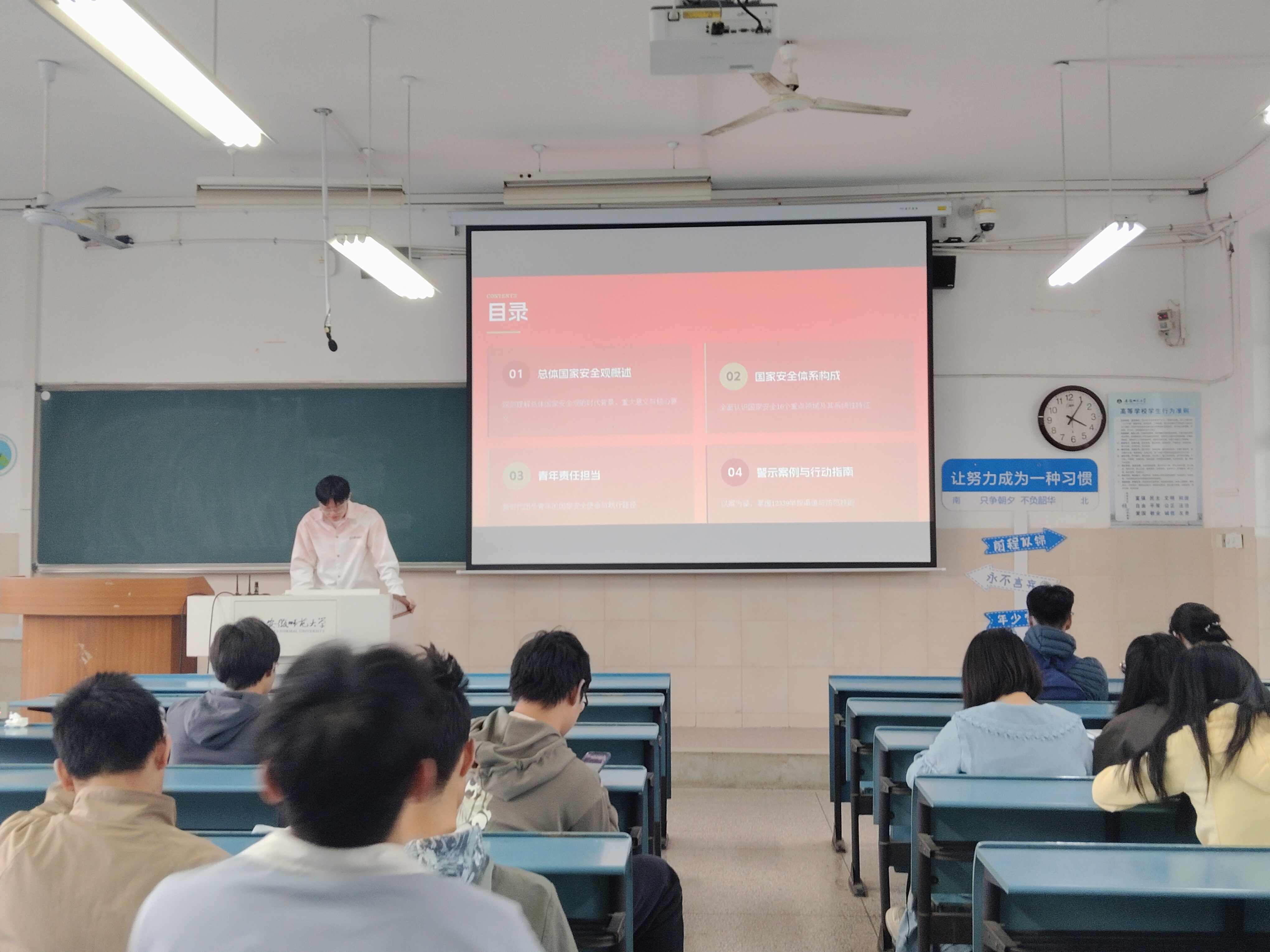 活动伊始,团支书围绕总体国家安全观展开系统讲解,从时代背景、重大意义、核心要义到“五大要素”“五对关系”“十个坚持”,带领同学们全面认识新时代国家安全的丰富内涵,深刻领会“国家安全是民族复兴的根基,社会稳定是国家强盛的前提”的重要论断。