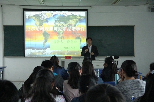 会上,查良松教授通过分析世界地形图中海洋陆地的分布,进而引出厄尔尼诺现象主要发生地点——南美洲。接着,查良松教授结合具体的动态图形向各位同学详细地解释了什么是“厄尔尼诺现象”、“厄尔尼诺”的起源、“厄尔尼诺”的危害以及“厄尔尼诺”的周期时间。之后,查良松教授用具体的例题帮助各位同学加深对“厄尔尼诺现象”的理解。他提出对于“厄尔尼诺现象”近年频发从而危及到太平洋沿岸生物的疑问以及“厄尔尼诺事件”对我国的影响,鼓励大家积极去思考当代时事,了解事情发生的原因,再去解决问题。他强调,作为当代大学生,应学好专业知识,用知识的头脑去思考、去探索自然界的未知问题。